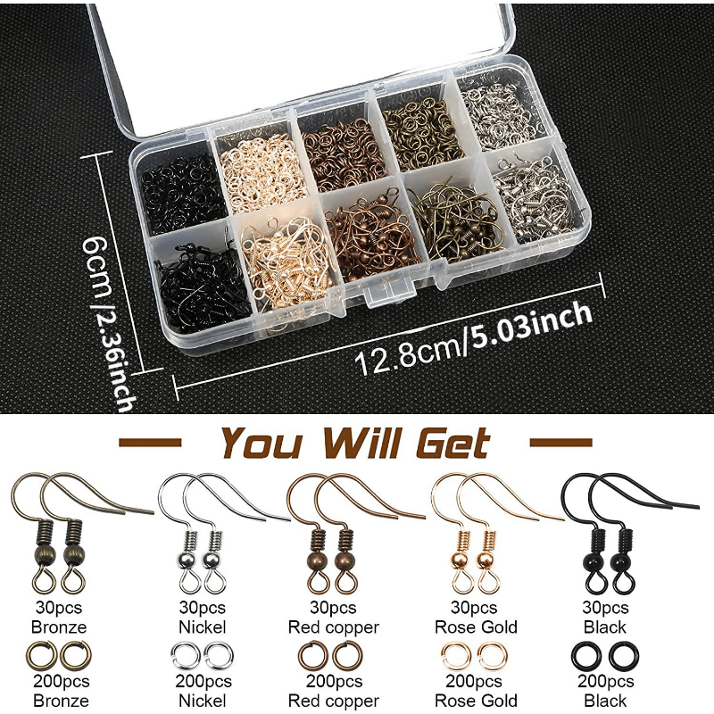 This 1150-piece earrings set includes earring hooks, open jump rings, and ear plug connects, perfect for creating your own jewelry designs.