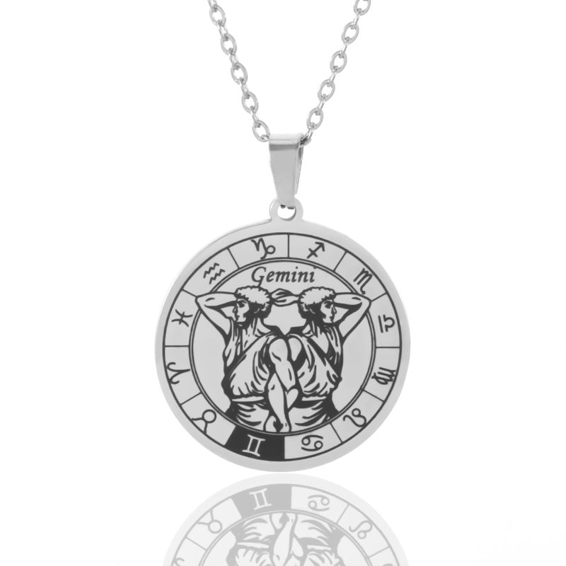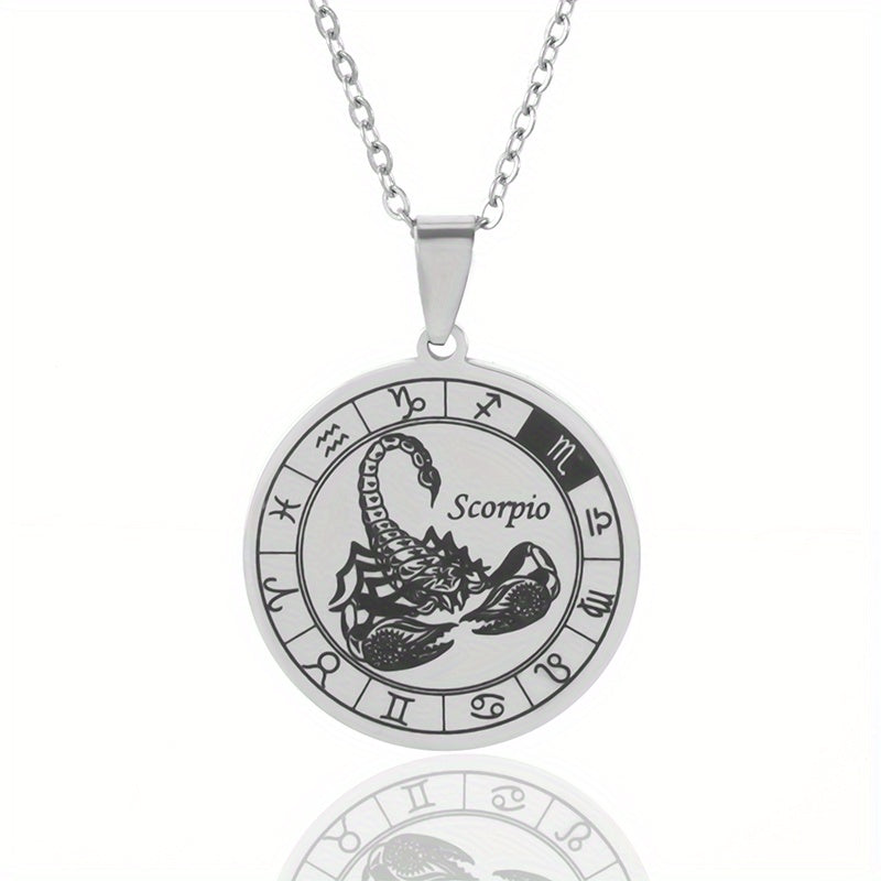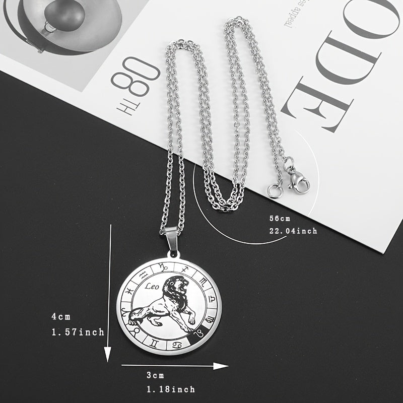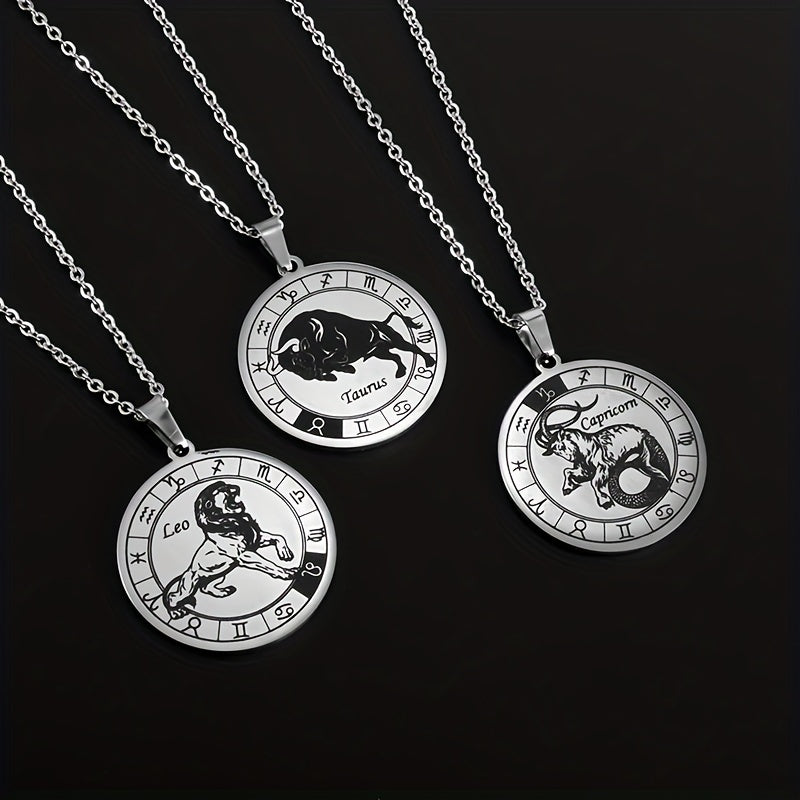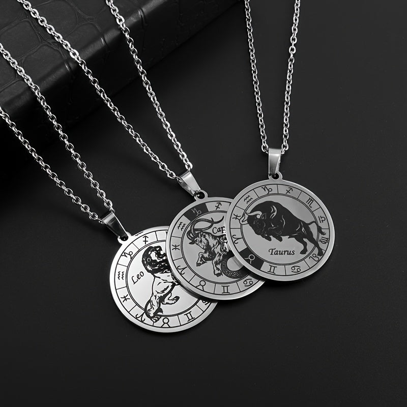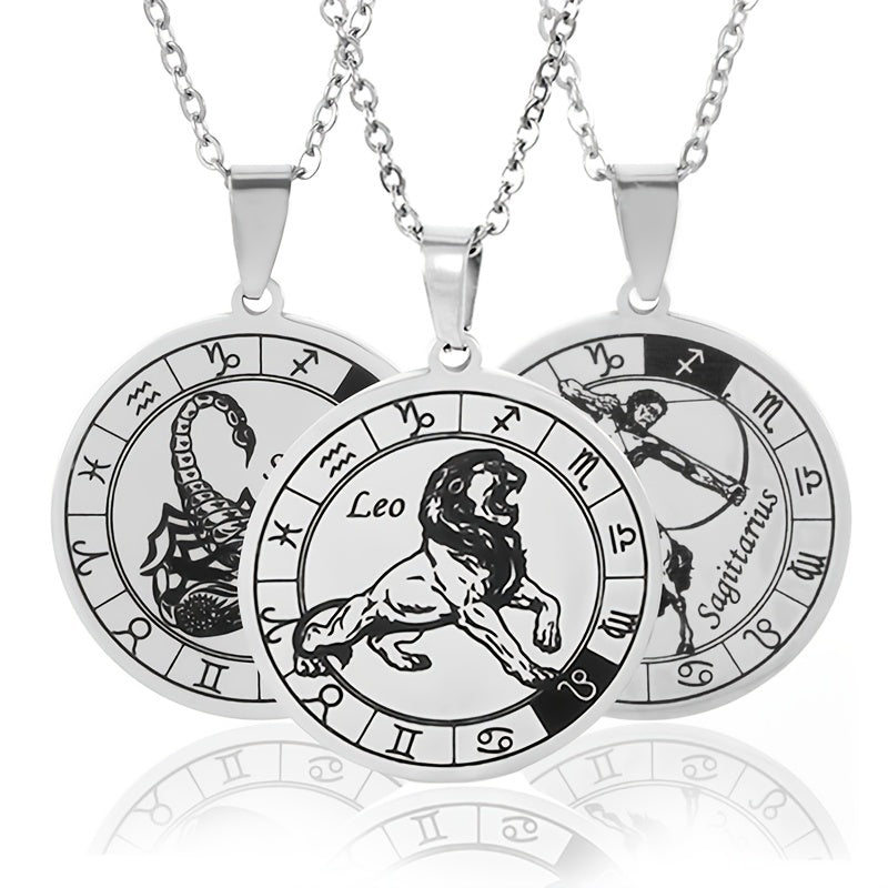 Add a touch of celestial charm with this silvery stainless steel pendant necklace featuring the 12 zodiac signs. Perfect accessory for men.