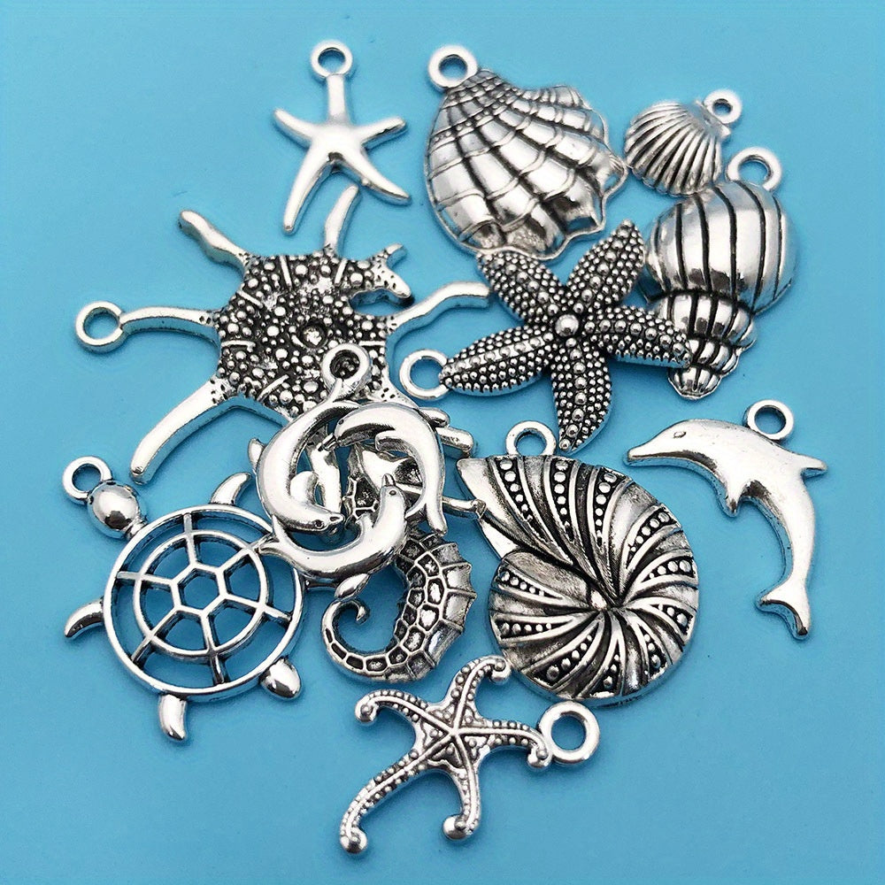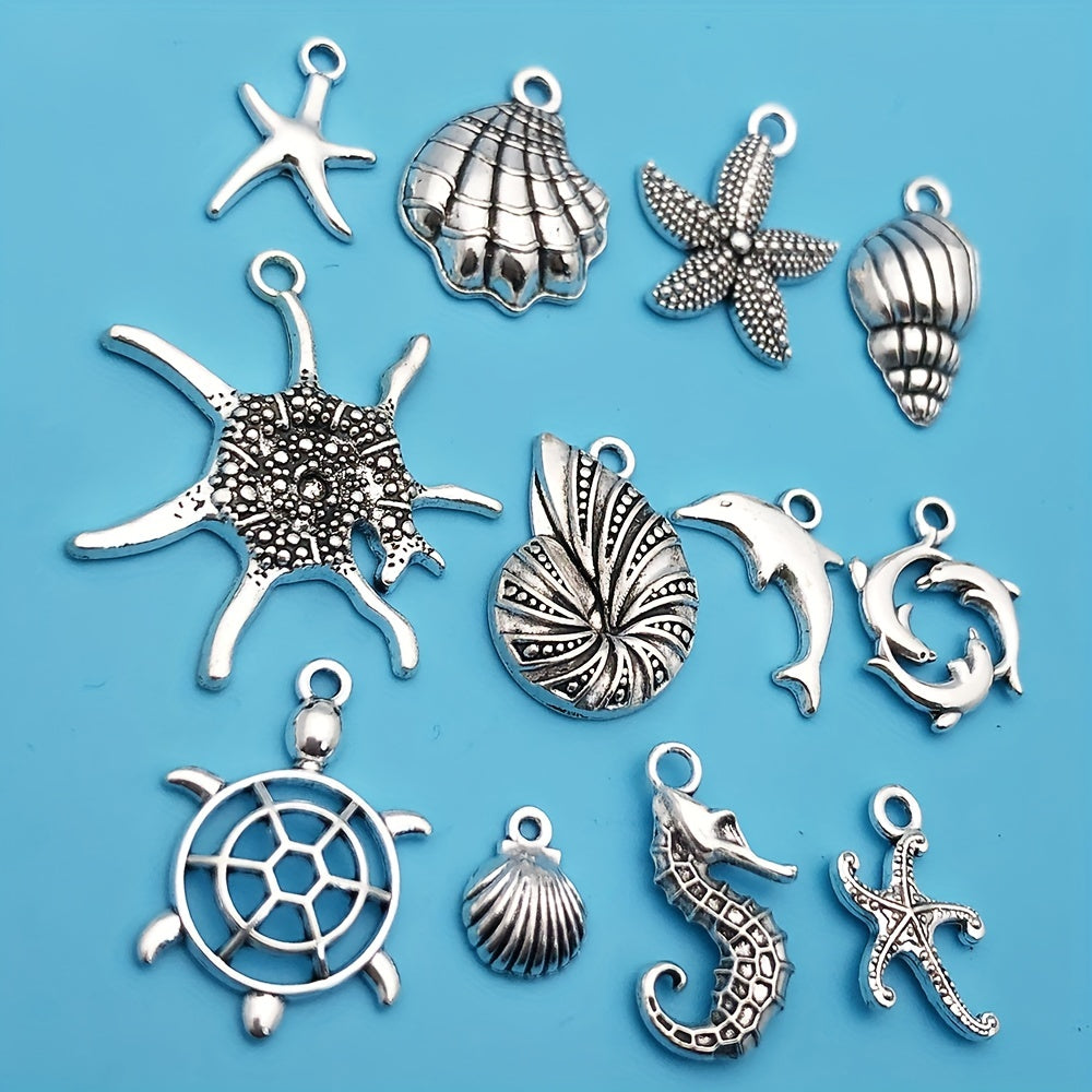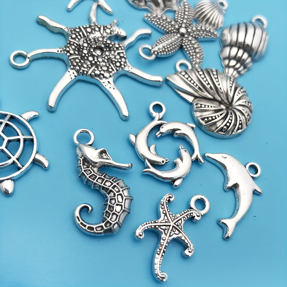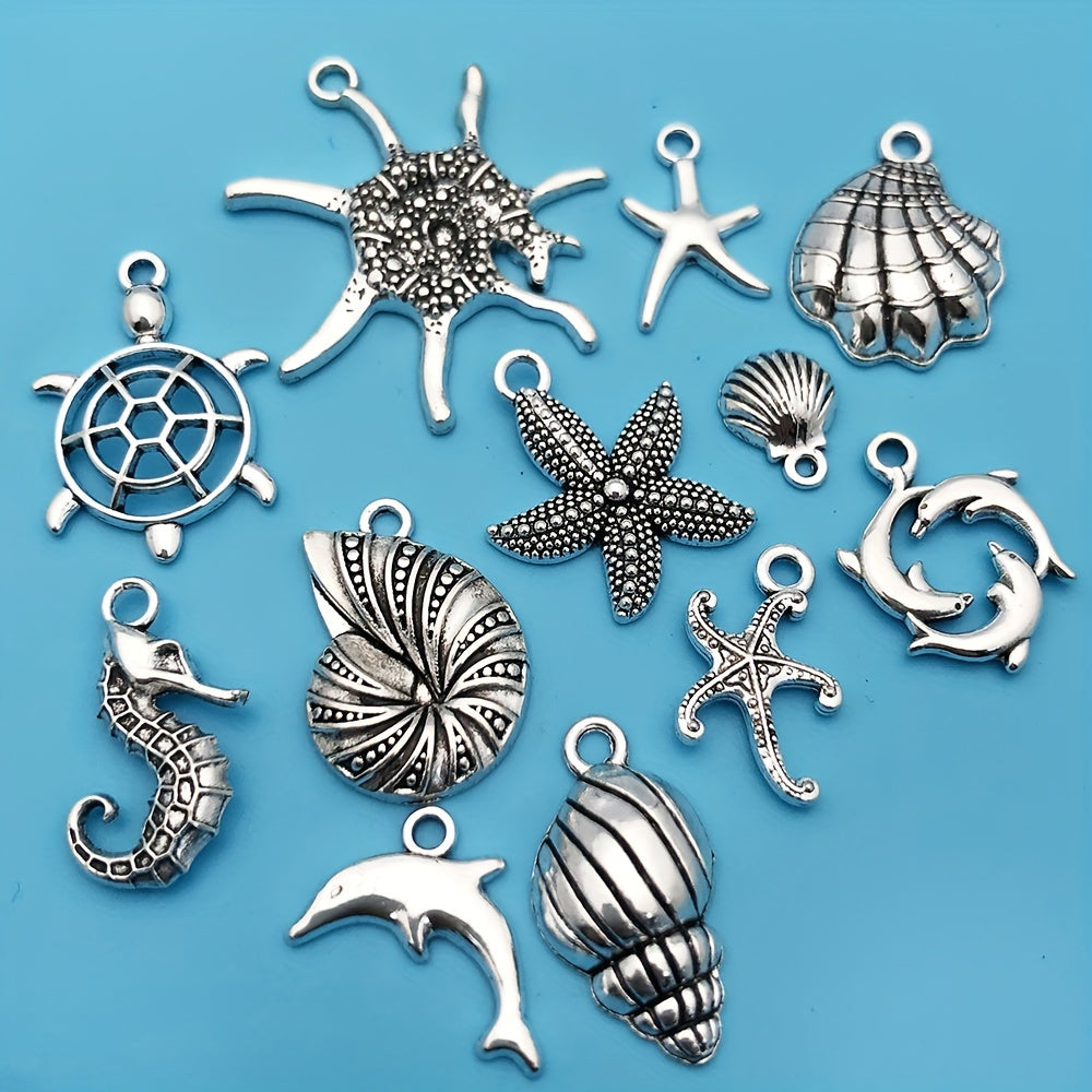 Enhance your jewelry making with this set of 12 antique silver marine life charms pendants featuring designs like turtle, octopus, starfish, and shell. Perfect for DIY necklaces and bracelets.