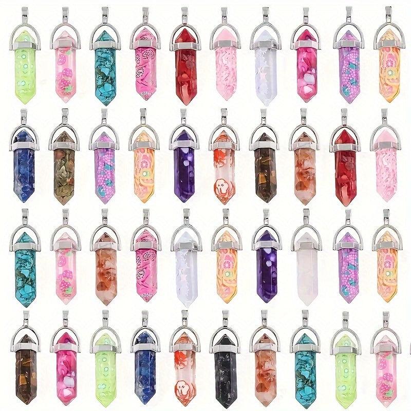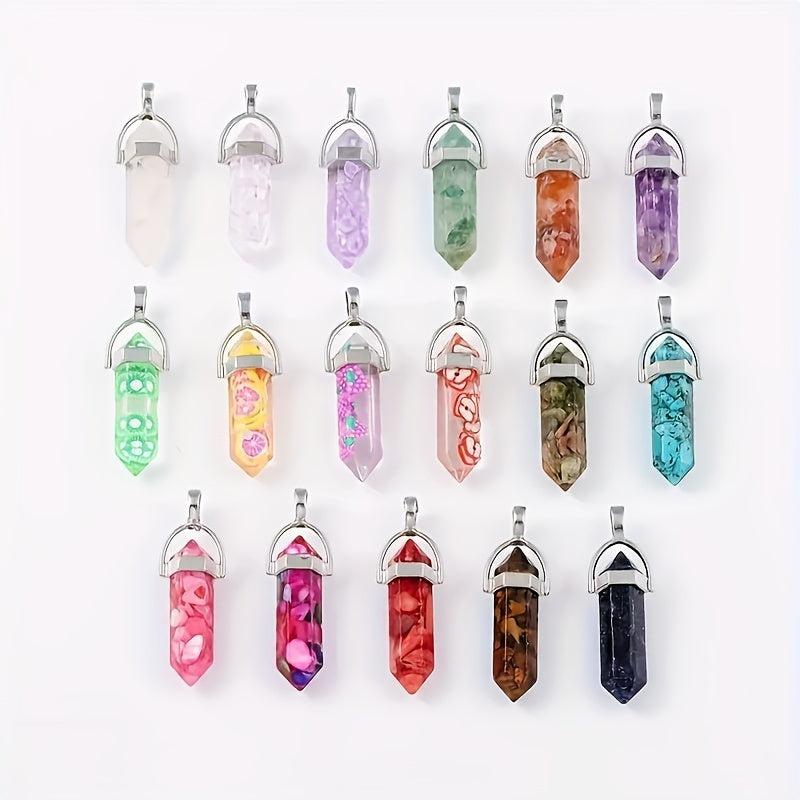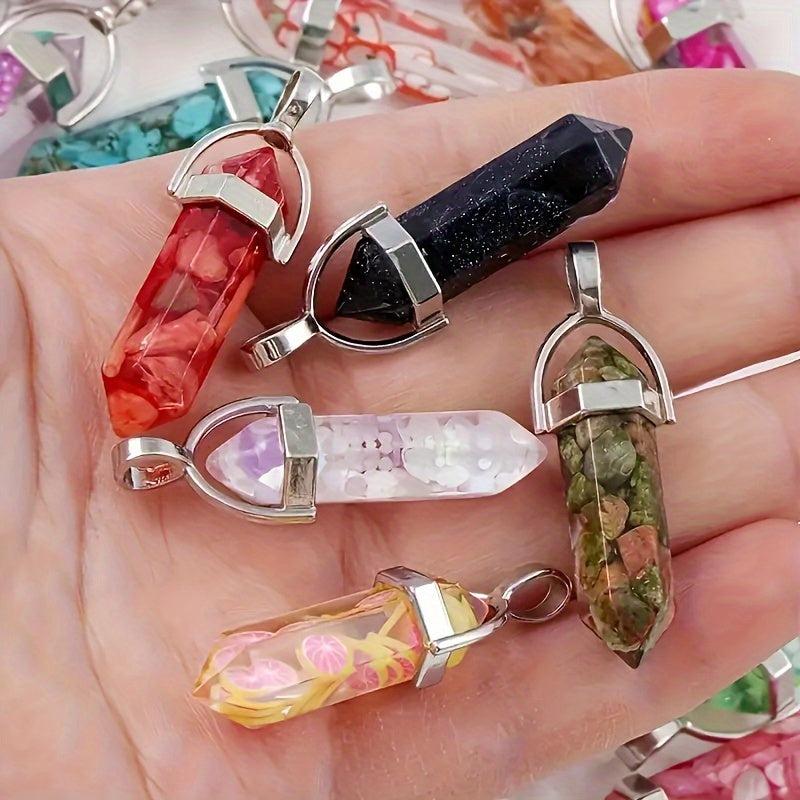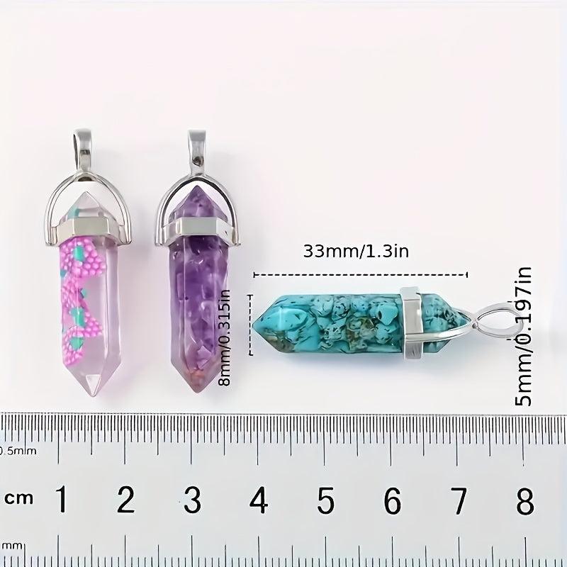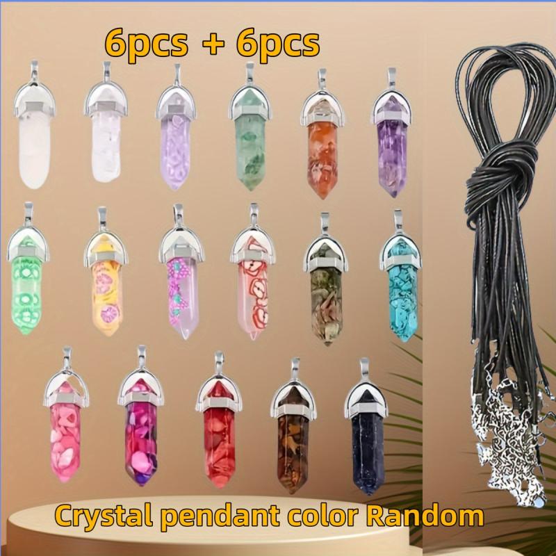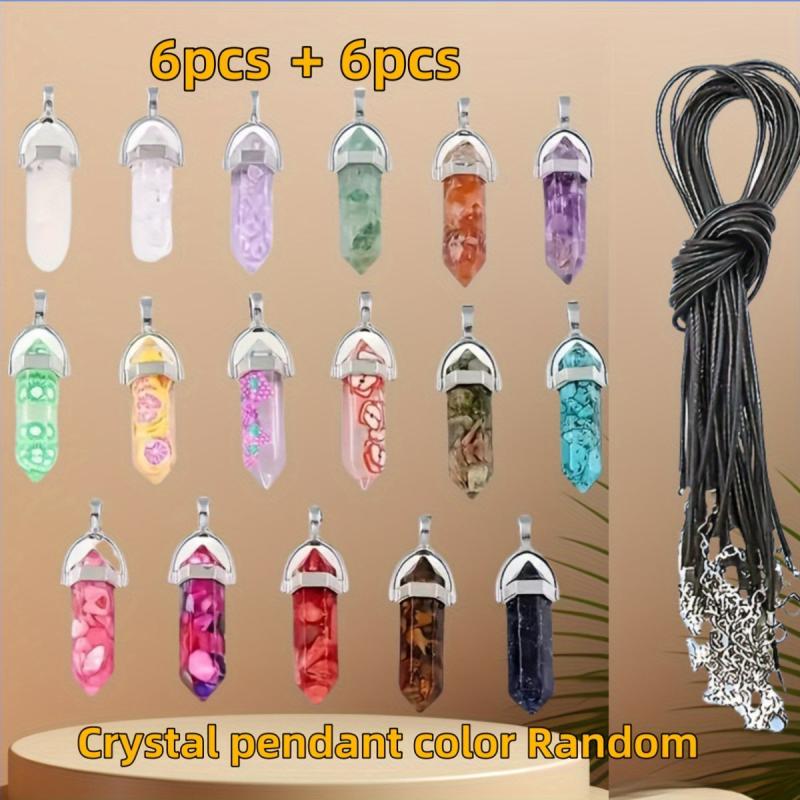 Elevate your boho look with this set of 12 crystal pendant necklaces featuring hexagonal and teardrop shapes. Made with synthetic resin, these necklaces add a touch of elegance and charm to any outfit.