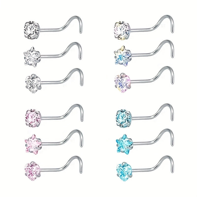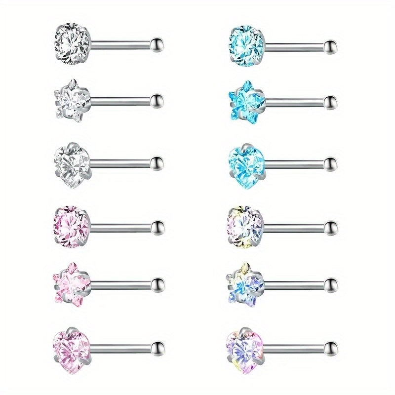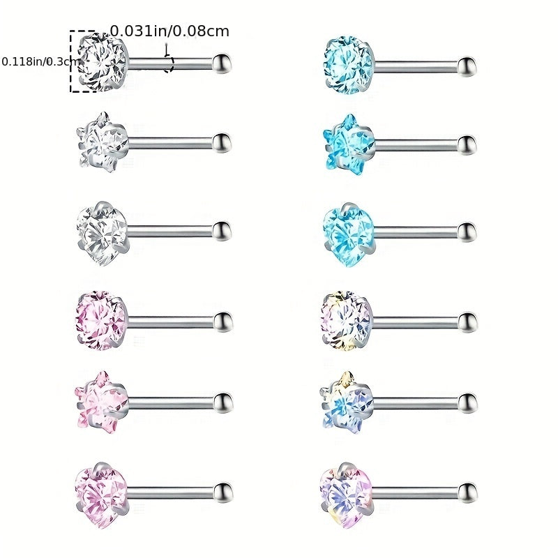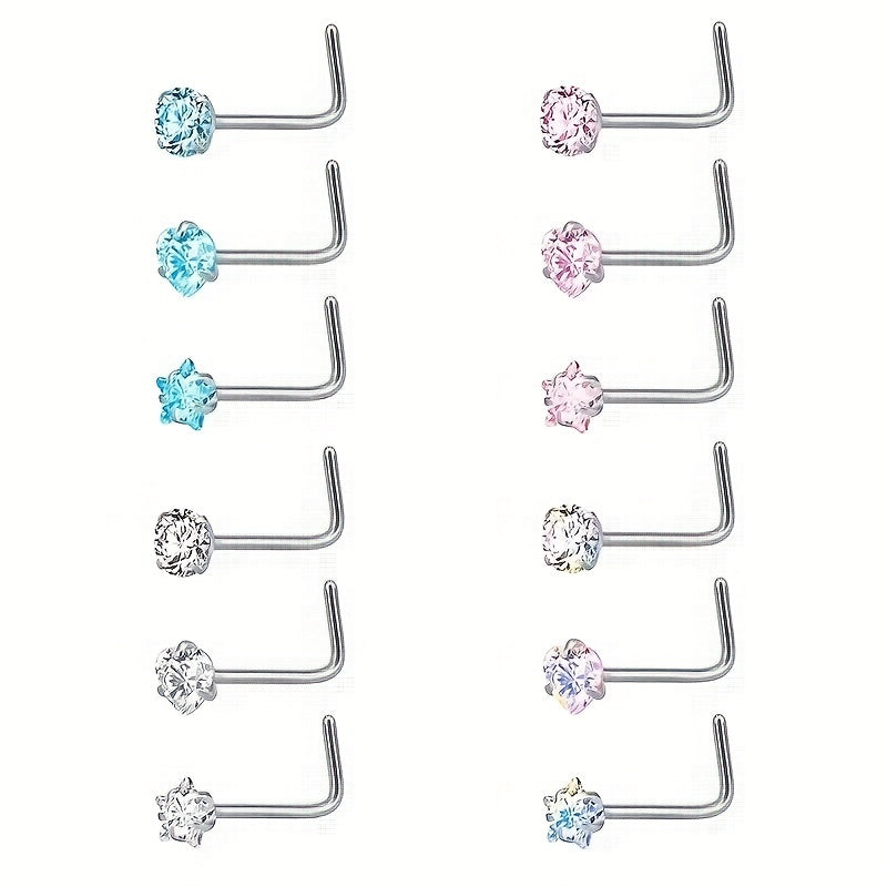 This set includes 12 nose studs in various designs made of surgical stainless steel. Perfect for everyday wear and ideal for those with nose piercings.