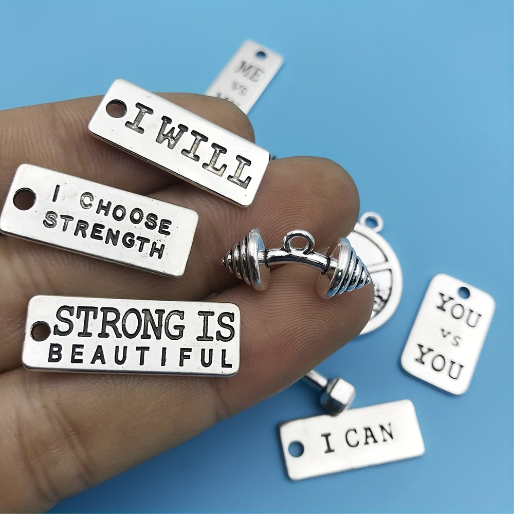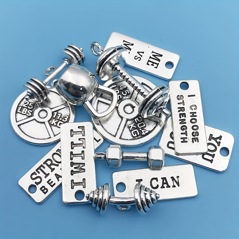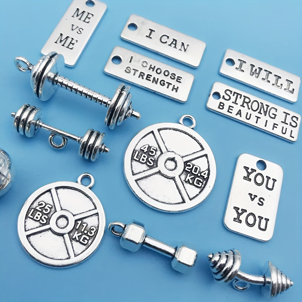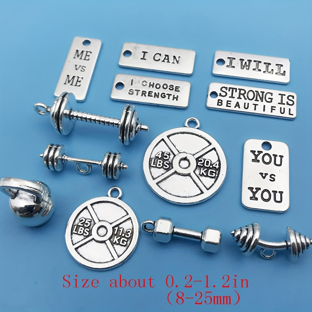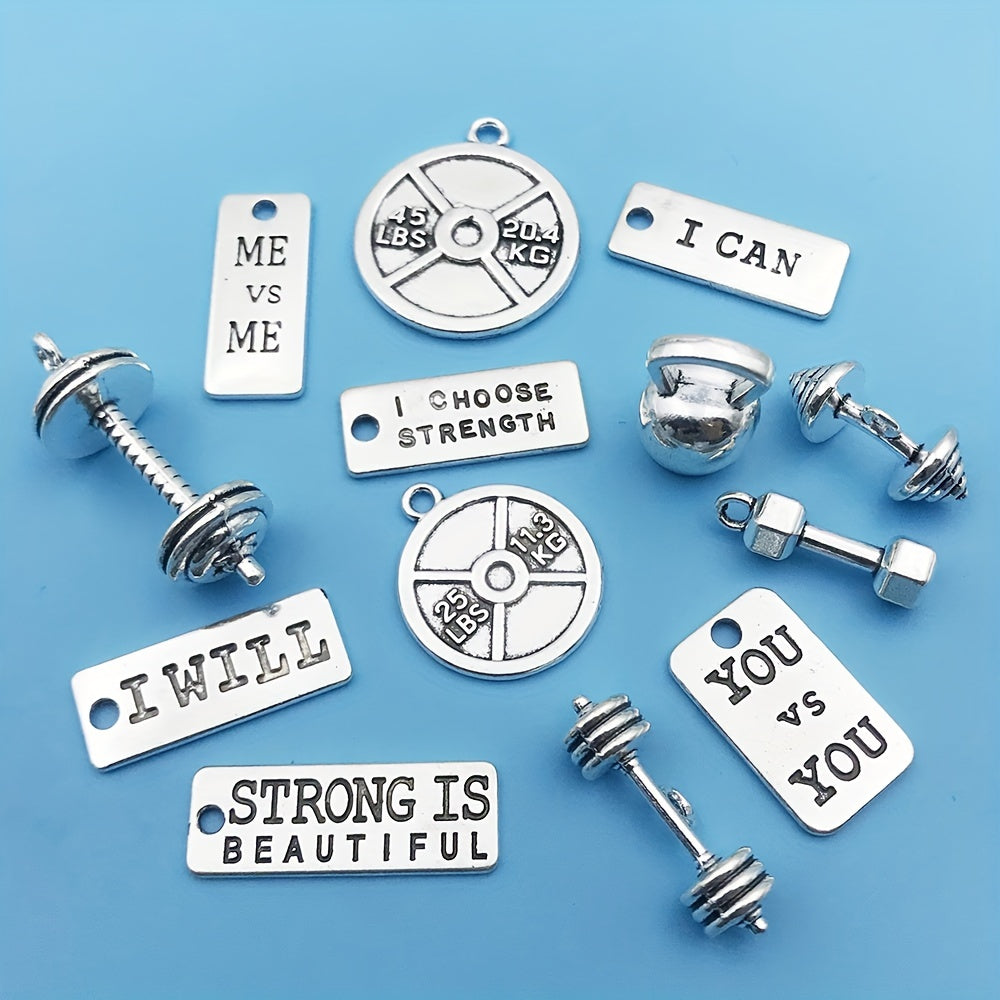 This set includes 13 antique silver weight lifting sport charms pendants perfect for strength tags, kettle bell, dumbbell, barbell, and weight findings crafting.