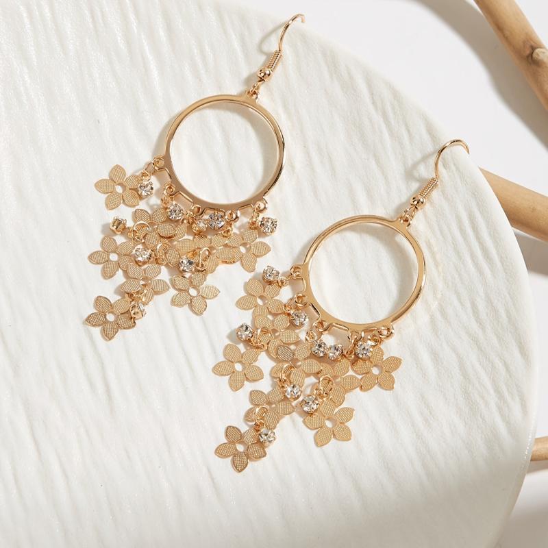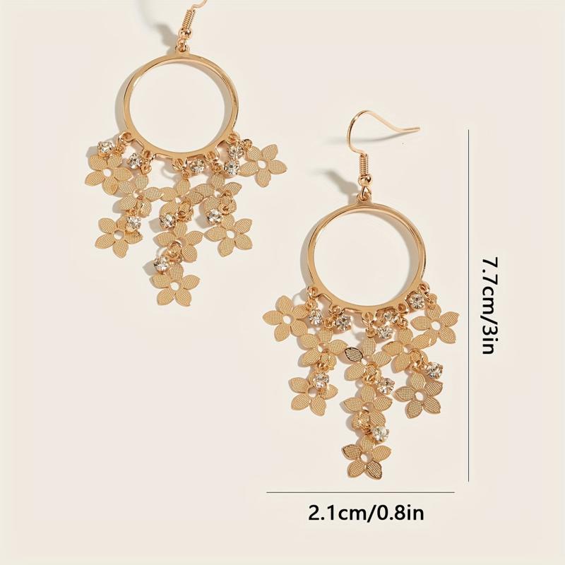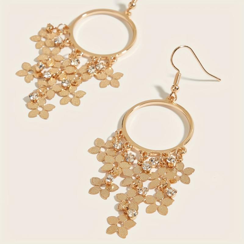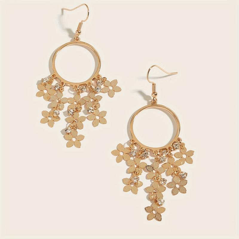 Add a touch of elegance to your outfit with these golden plated flower drop earrings featuring rhinestone accents. Perfect for daily wear or holiday occasions.