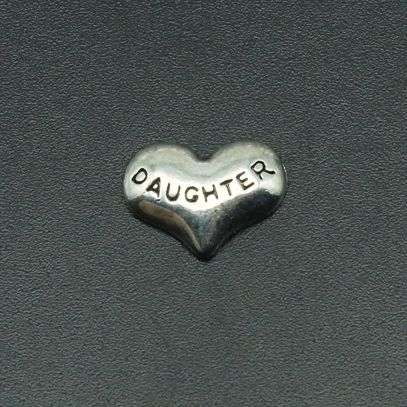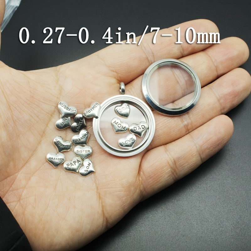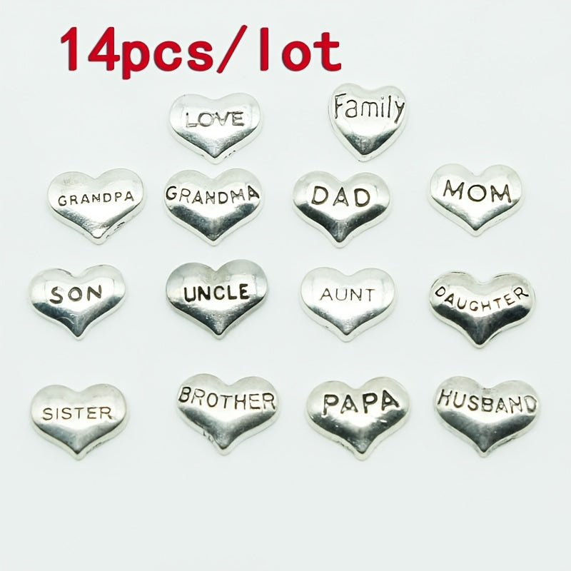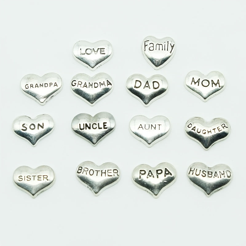 Enhance your DIY accessories with these 14 heart-shaped charms featuring carved letters of love for family members. Perfect for bracelets, necklaces, and other jewelry creations.