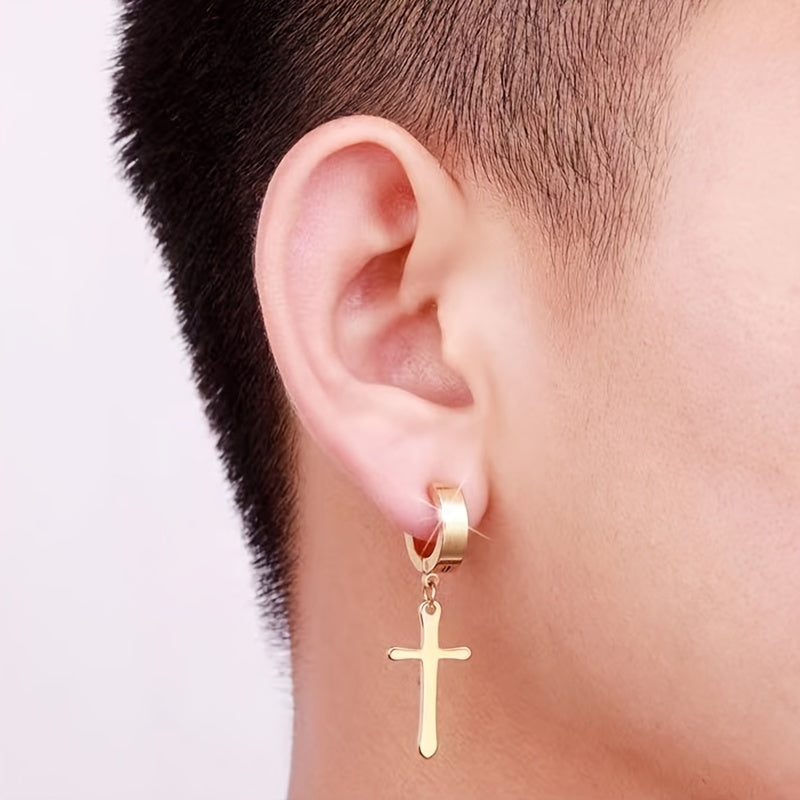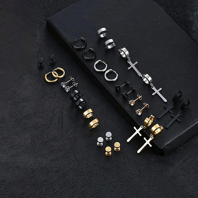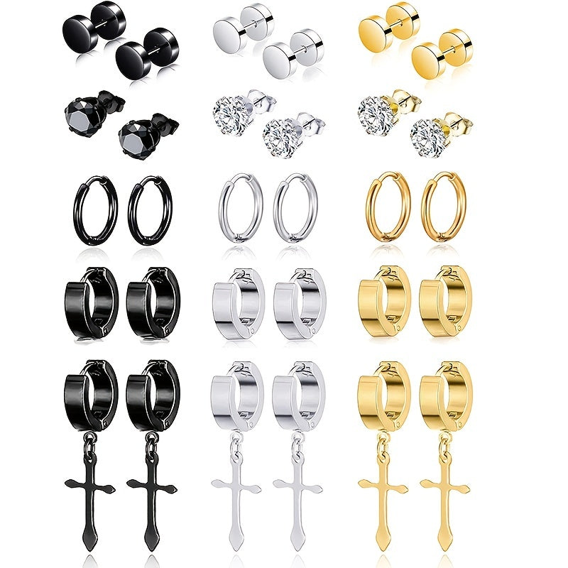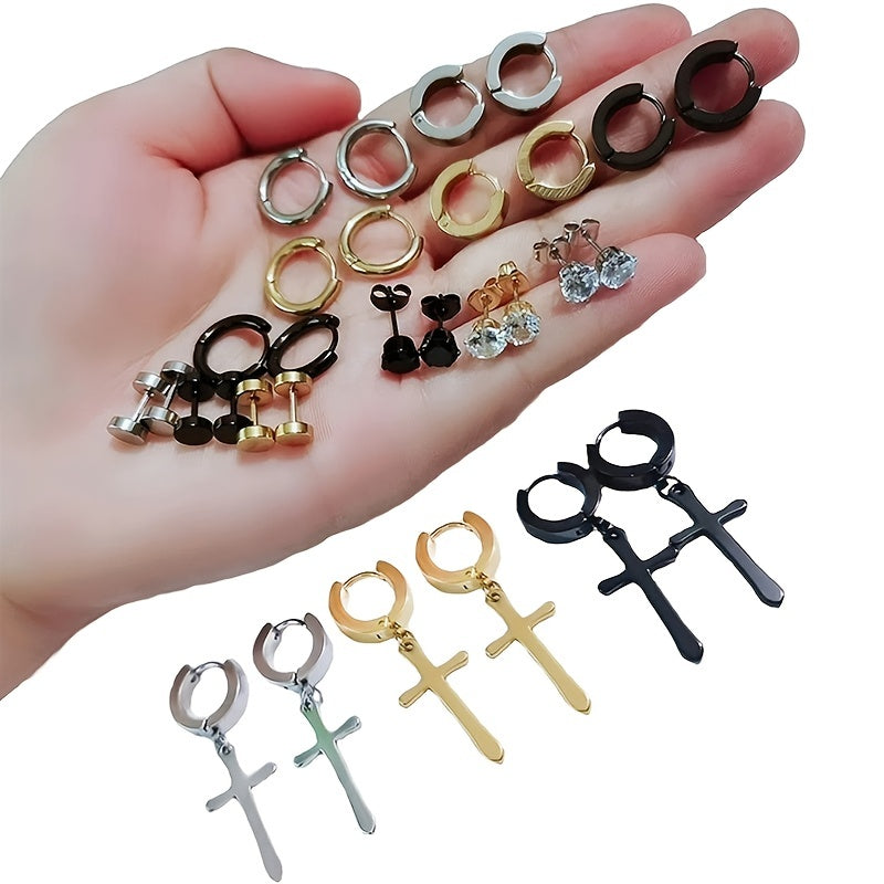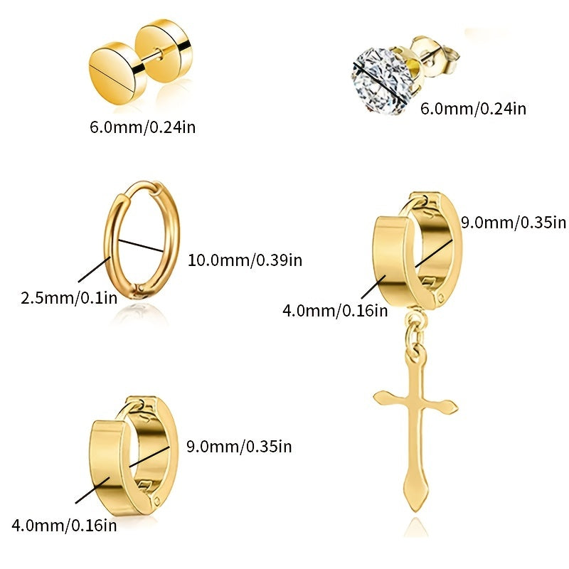 This set includes cross dangle, hinged hoop, and CZ stud earrings in silver and golden tone. Perfect for men and women for ear piercing jewelry.