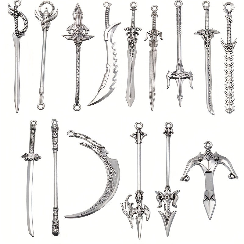 Enhance your jewelry creations with this set of 15 mixed alloy antique weapon charms including swords, guns, and bows. Perfect for DIY projects and crafting.