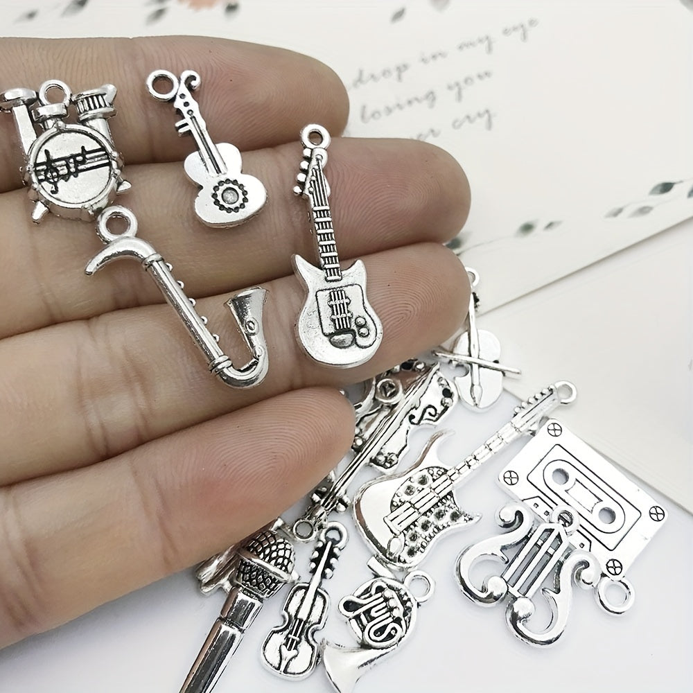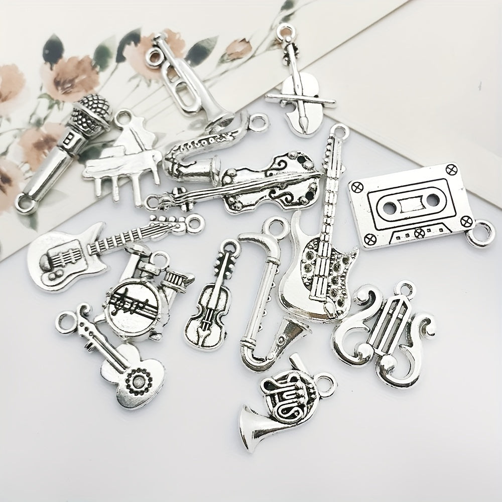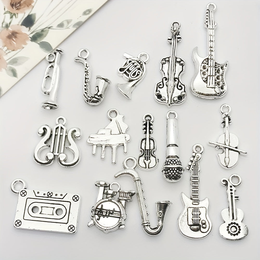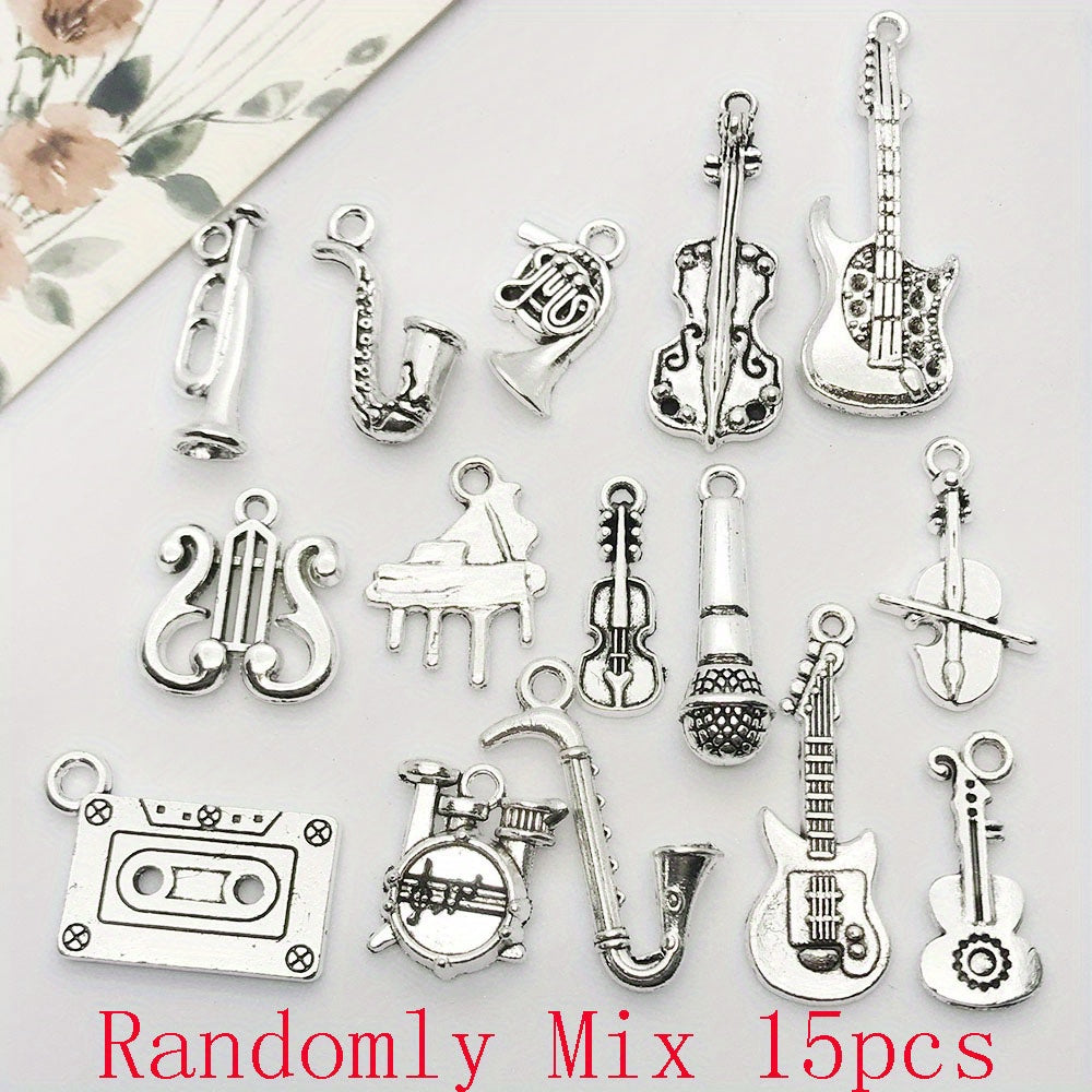 Add a touch of music to your jewelry creations with this set of 15 antique silver charms featuring guitar, piano, violin, and more. Perfect for crafting accessories or DIY necklaces.