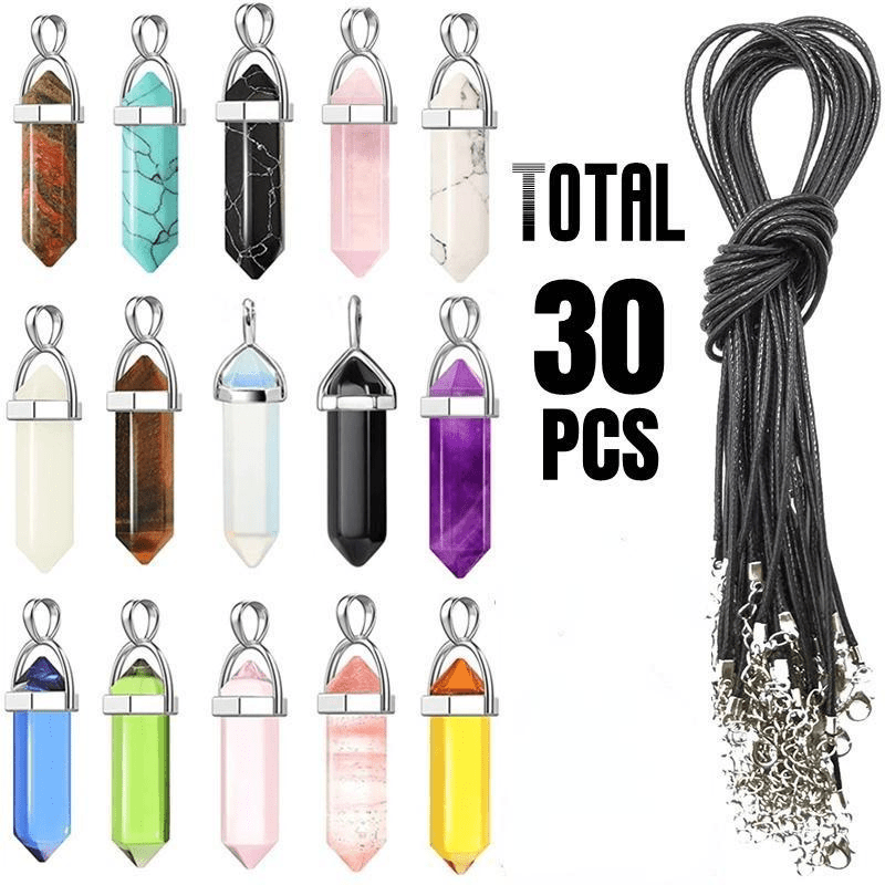 Add a touch of color and sparkle to your outfits with this set of 15 multicolor crystal pointed pendants. Each pendant comes with a leather necklace chain for easy wear.