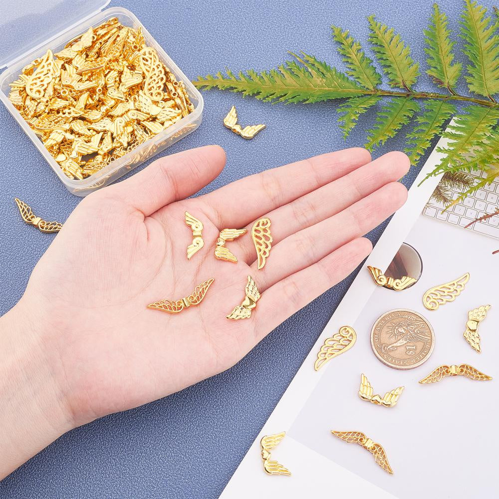 These golden wing alloy beads are perfect for creating unique earrings, bracelets, necklaces, and other accessories. Each bead measures 32x6x2.5mm with a hole size of 1mm.