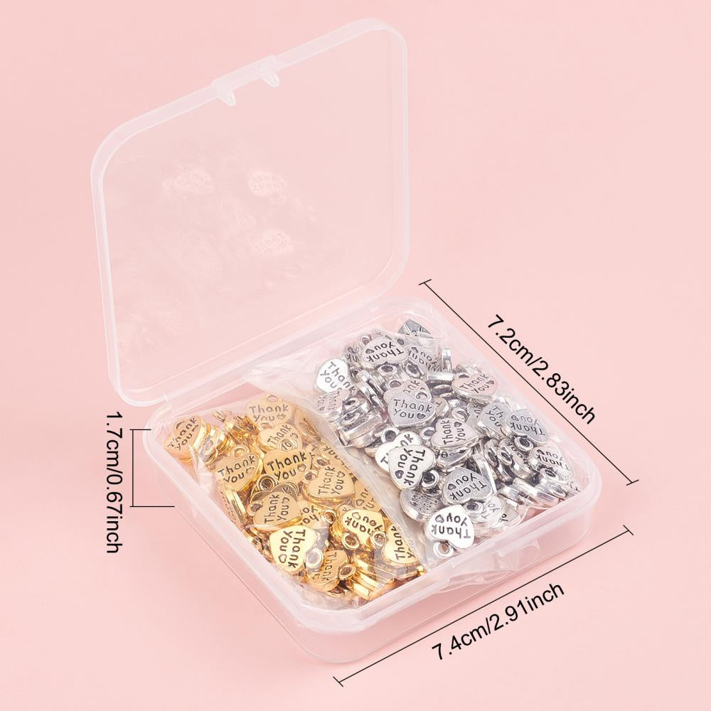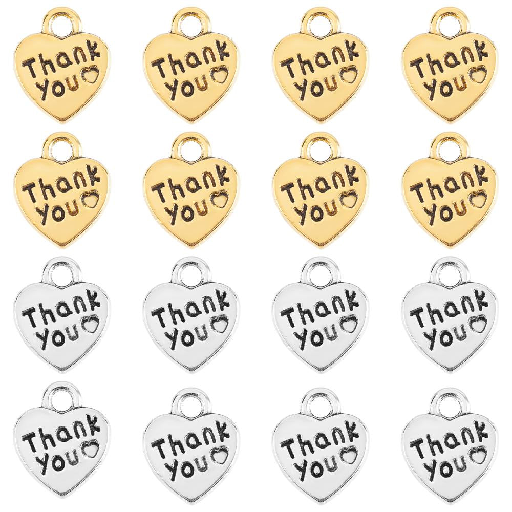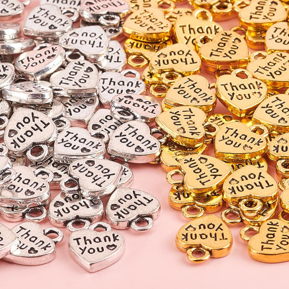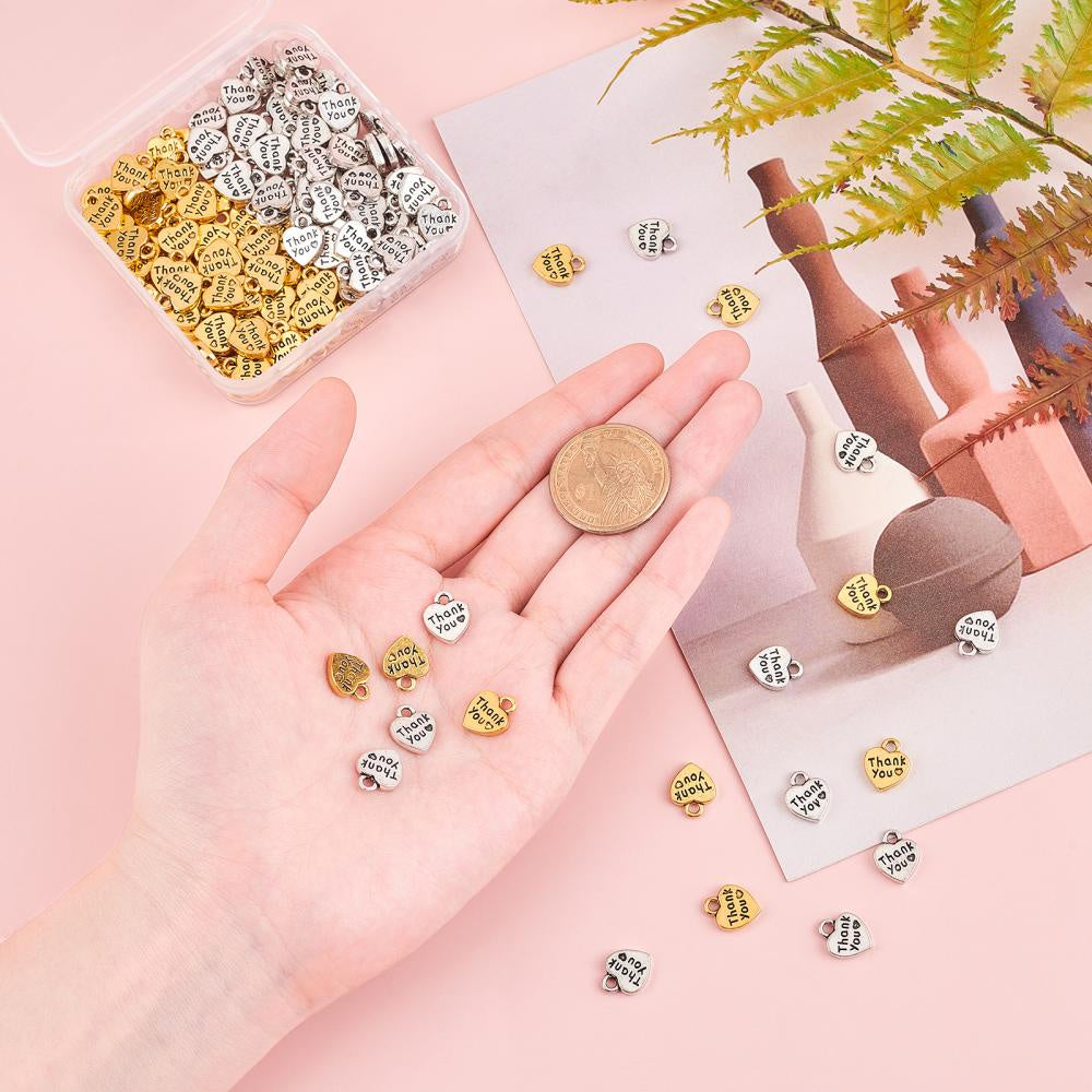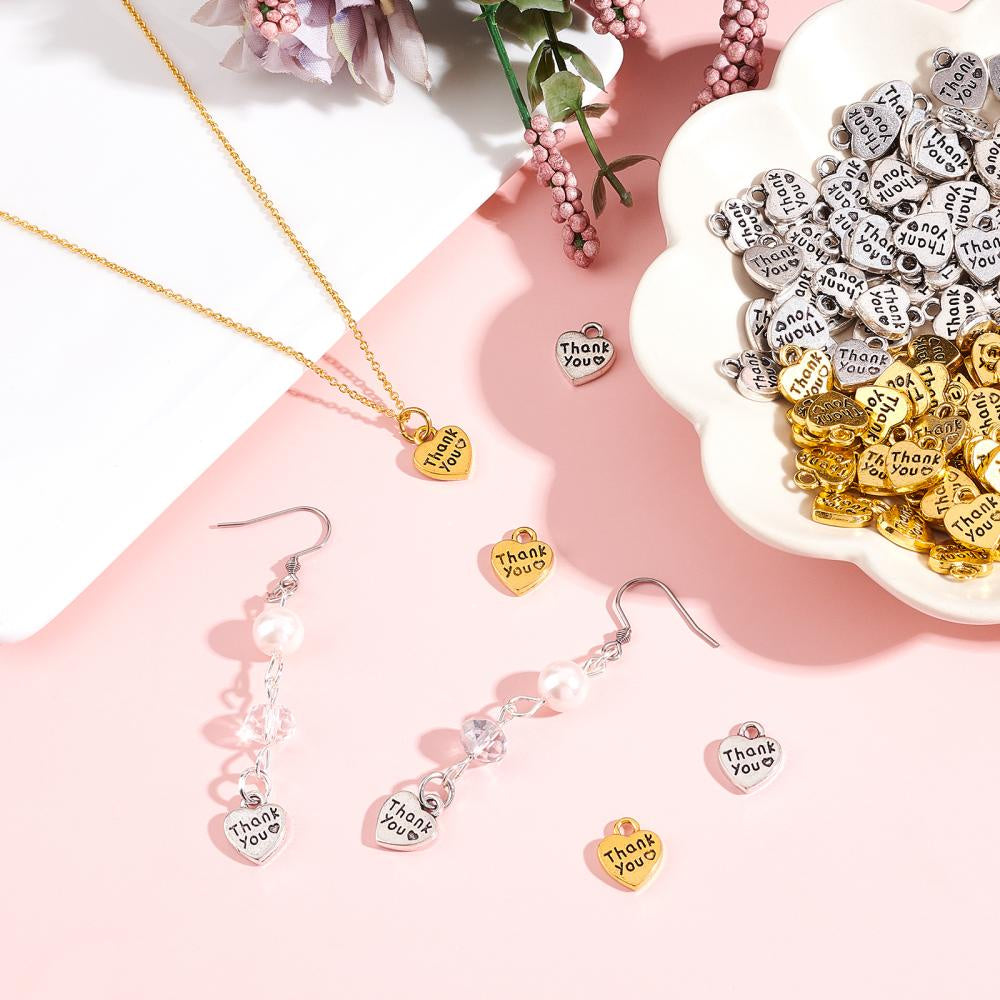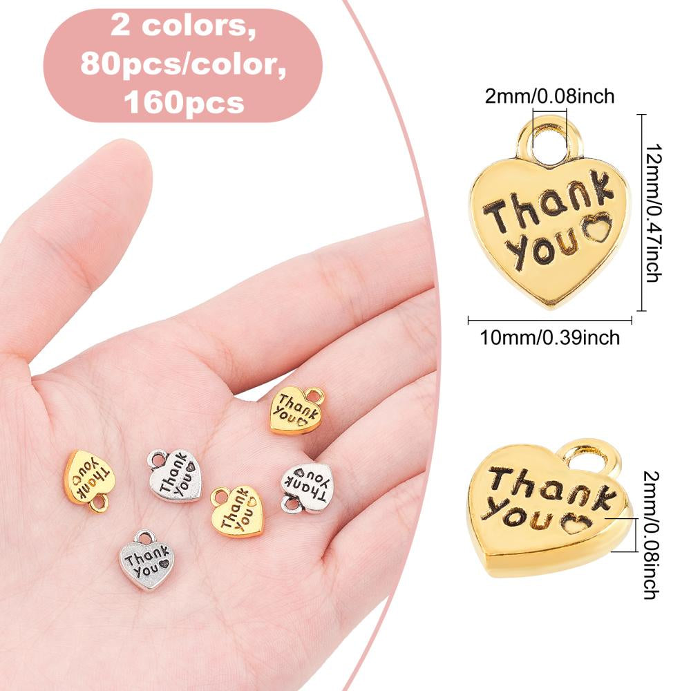 This set includes 160 pieces of heart shape pendant charms with the words 'Thank You' in antique silver and antique golden colors. Each charm measures 12x10x2mm with a 2mm hole.