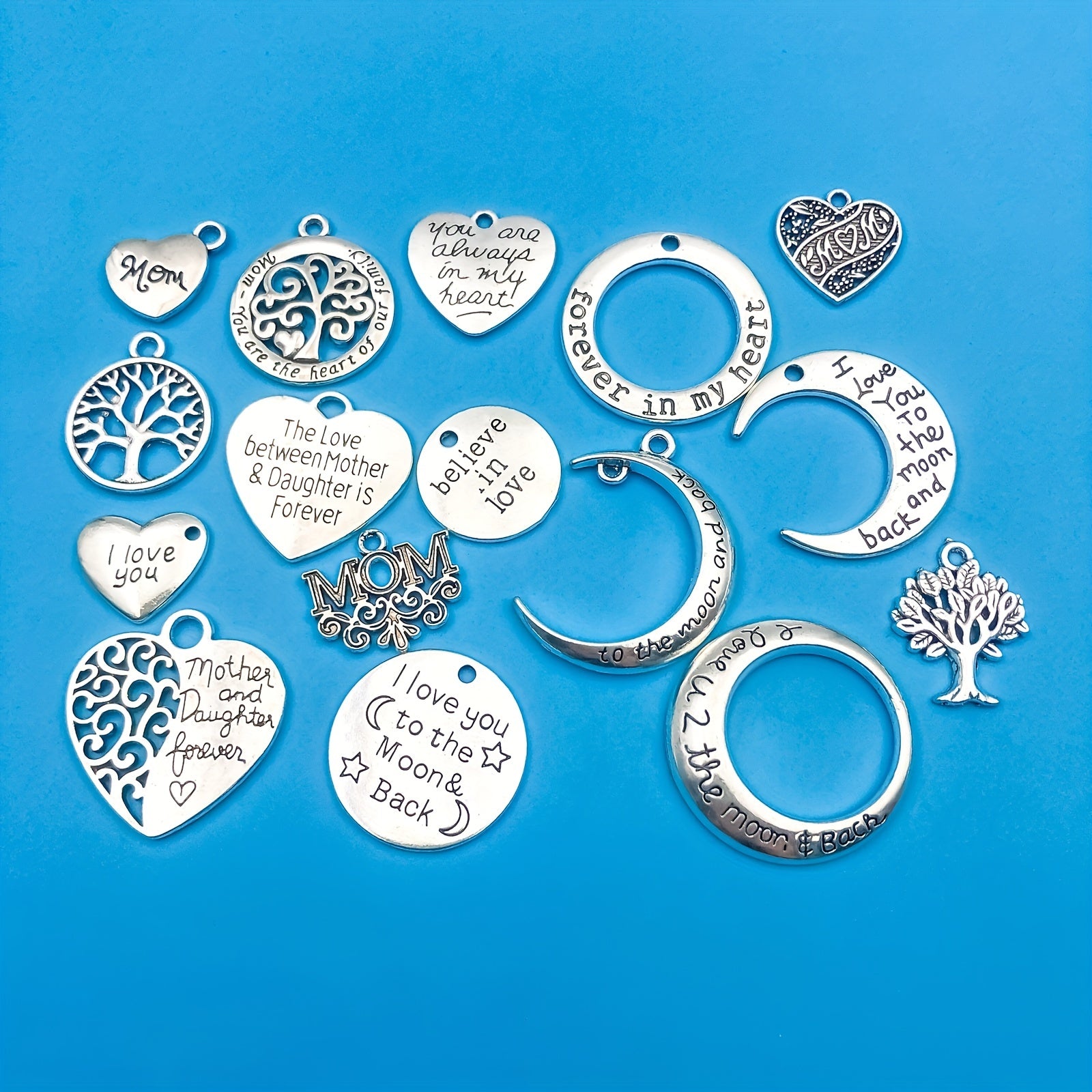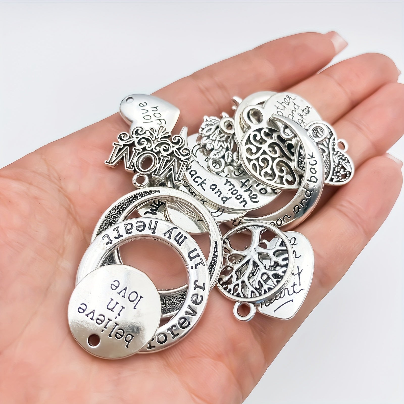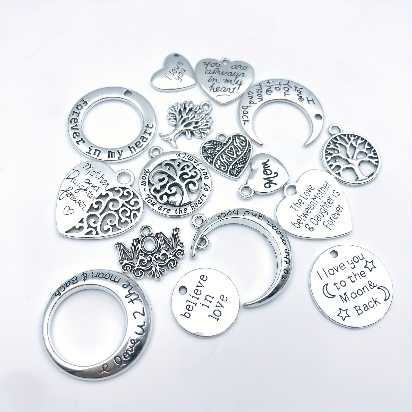 Create customized jewelry with this set of 16 zinc alloy antique silver charms. Perfect for necklaces, bracelets, and earrings. Ideal for expressing love for mom.