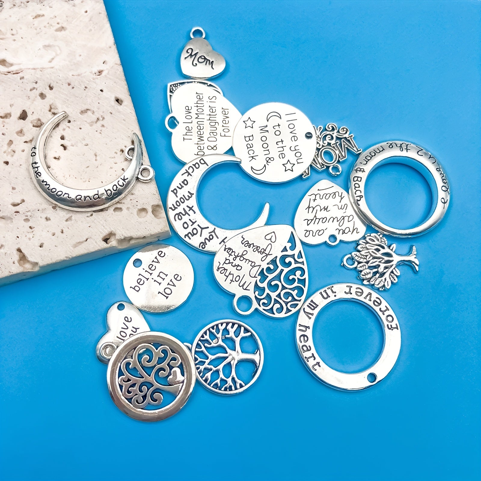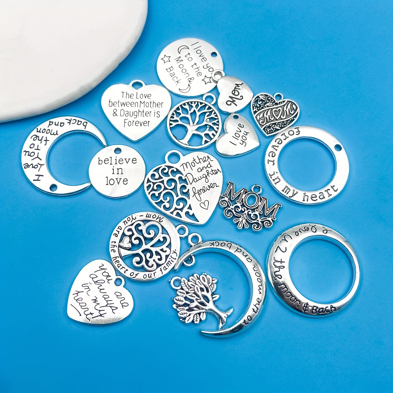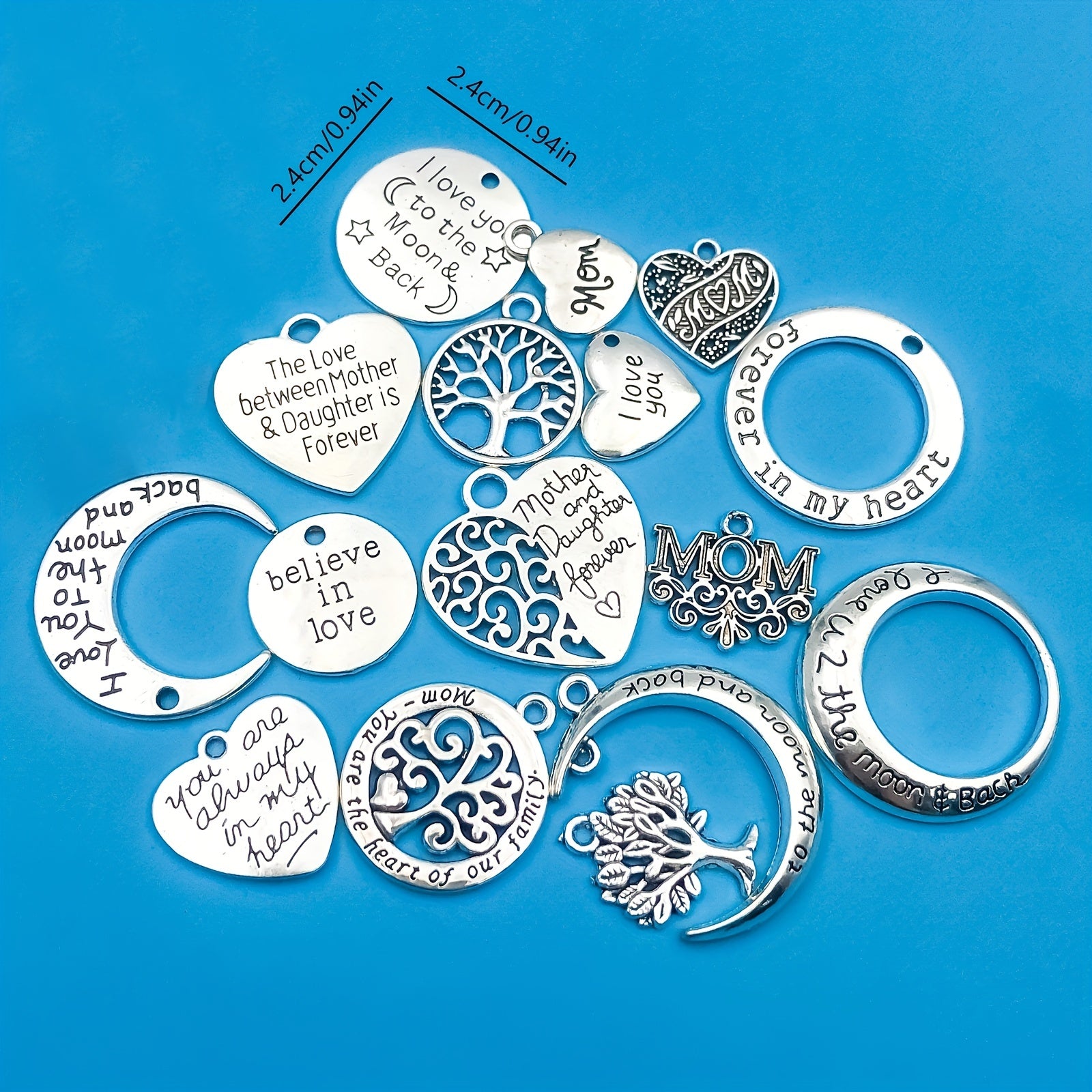 Create customized jewelry with this set of 16 zinc alloy antique silver charms. Perfect for necklaces, bracelets, and earrings. Ideal for expressing love for mom.