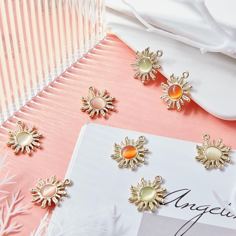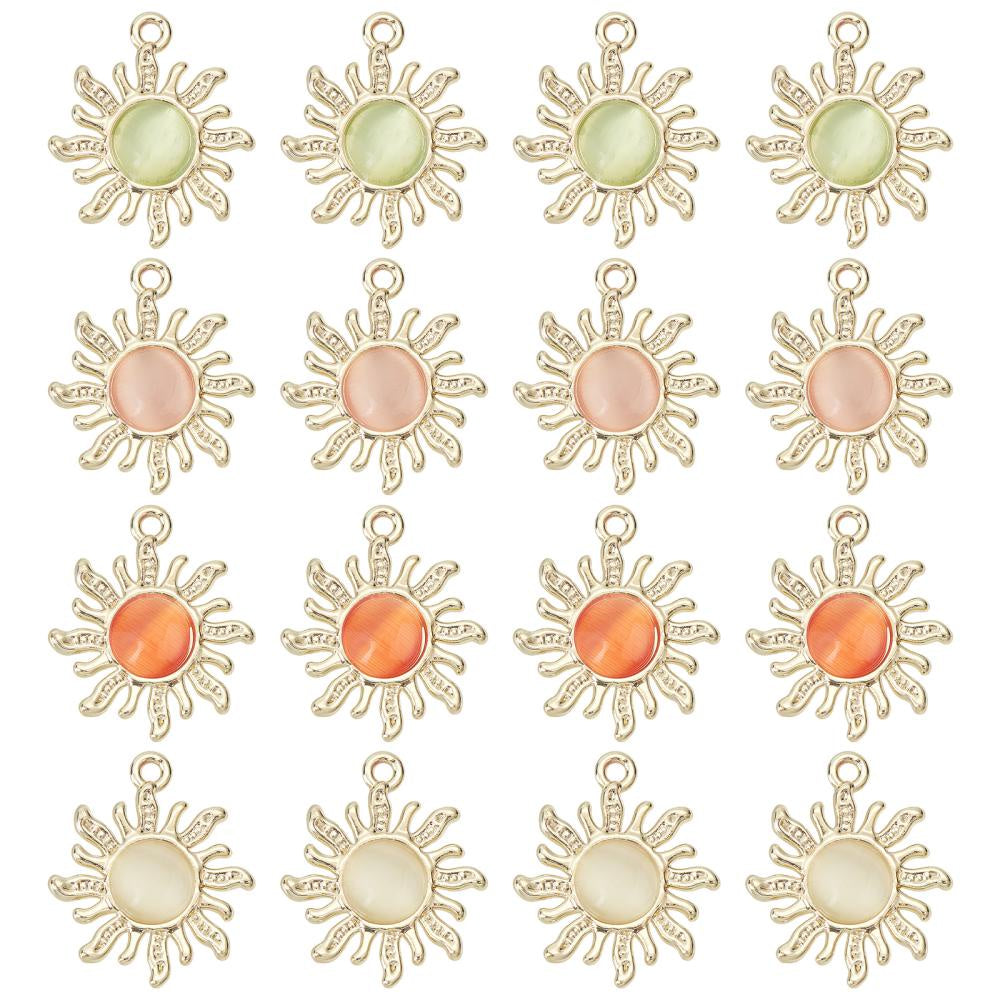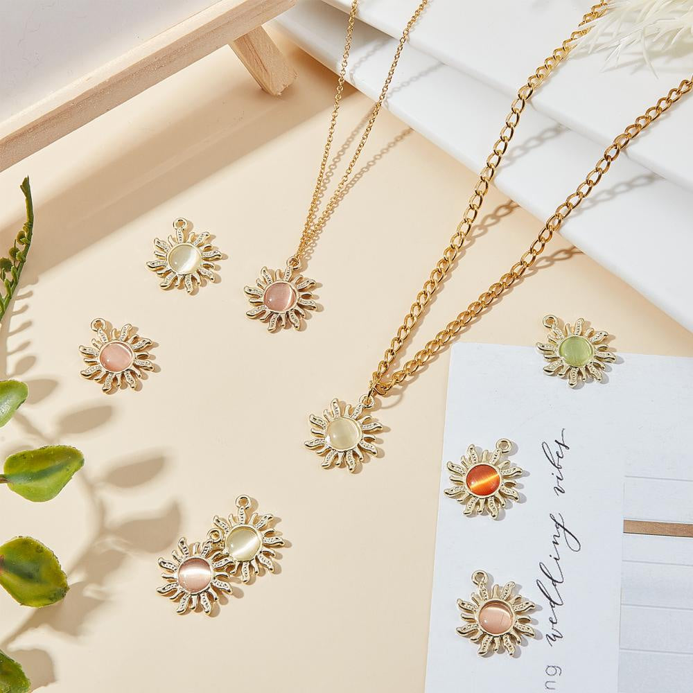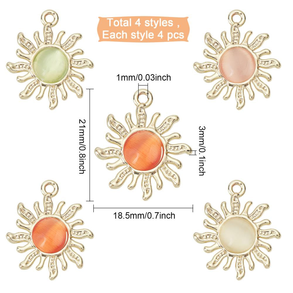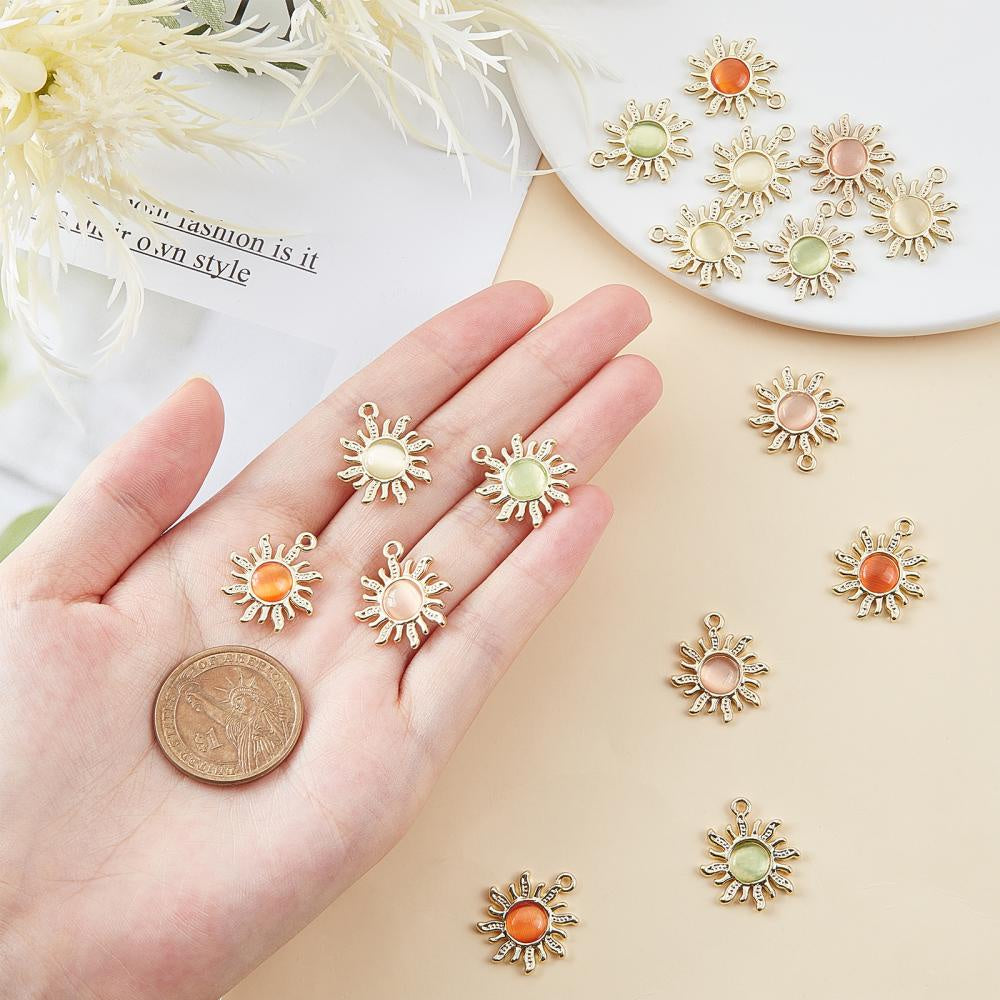This set includes 16 pieces of sunflower pendant charms with colorful glass cabochons, ideal for creating bracelets, necklaces, and more. The cabochons are half round and come in 4 different colors.