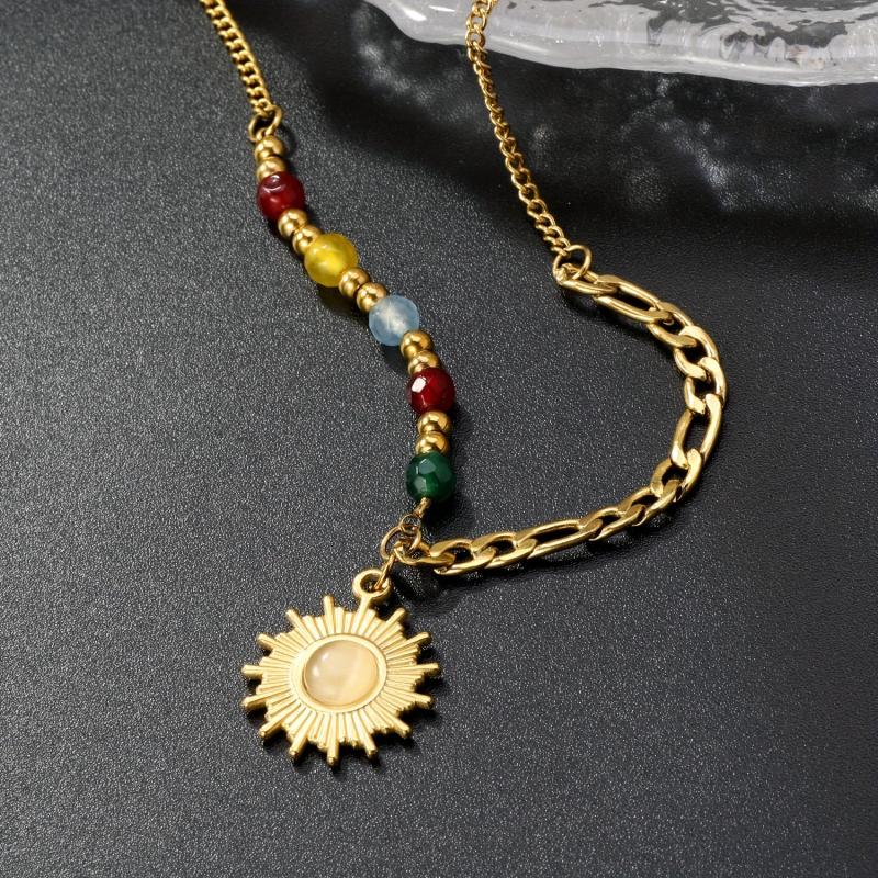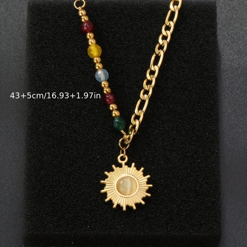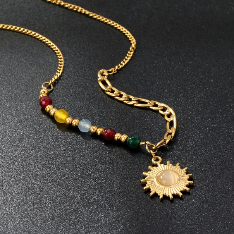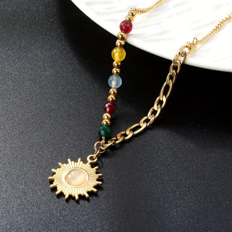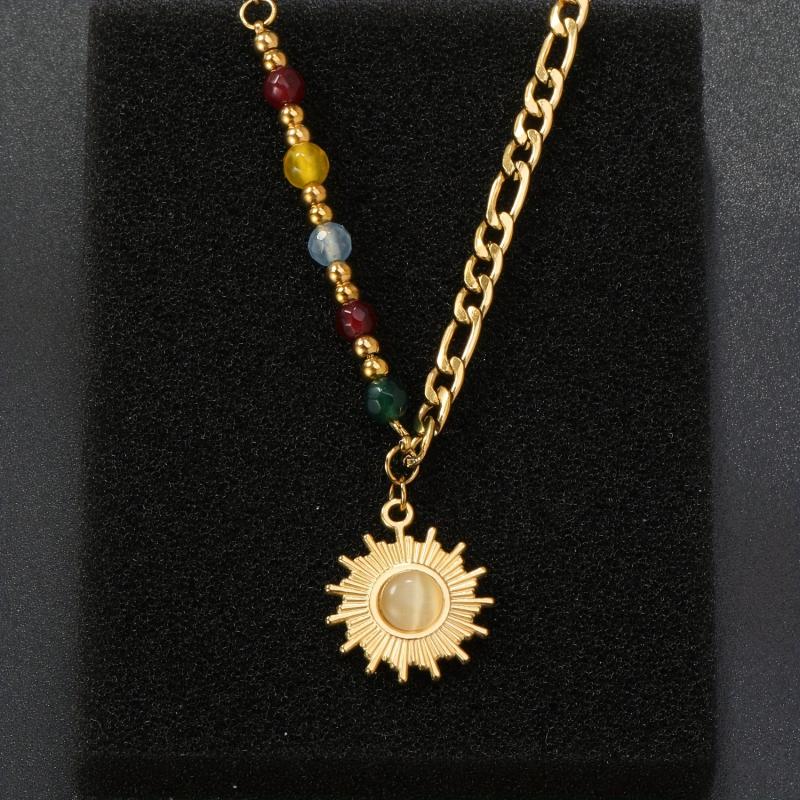 French-style stainless steel necklace with a sun god pendant and natural stone beads. Perfect for everyday wear.