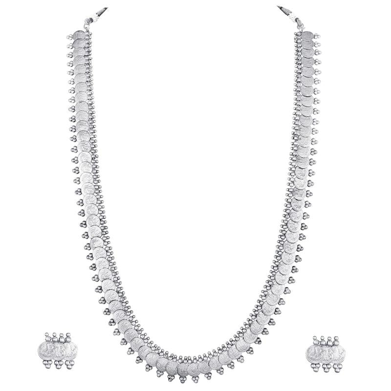 Complete your traditional look with this stunning 18K oxidised coin necklace and earrings set. Perfect for special occasions and festive gatherings.