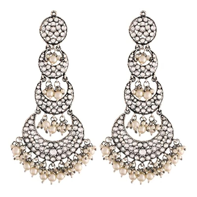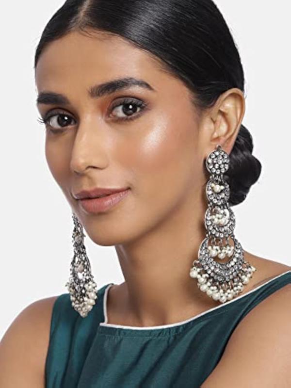 Exude traditional elegance with these intricately designed 18k oxidized earrings featuring kundans and pearls. The hair chain adds a unique touch to your ensemble.