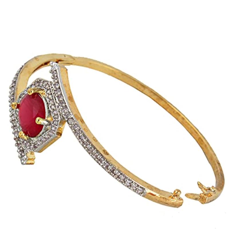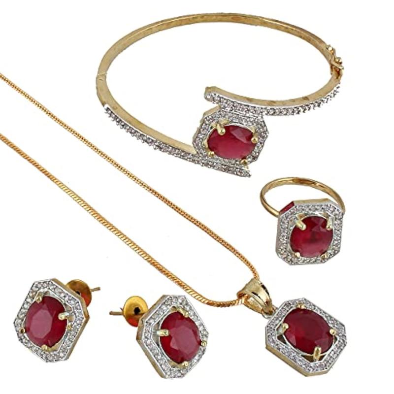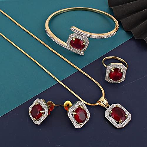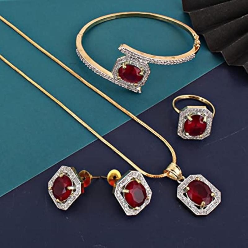 Beautifully crafted pendant set with maroon American Diamond stones. Includes matching earrings, bracelet, and ring. Perfect for special occasions.