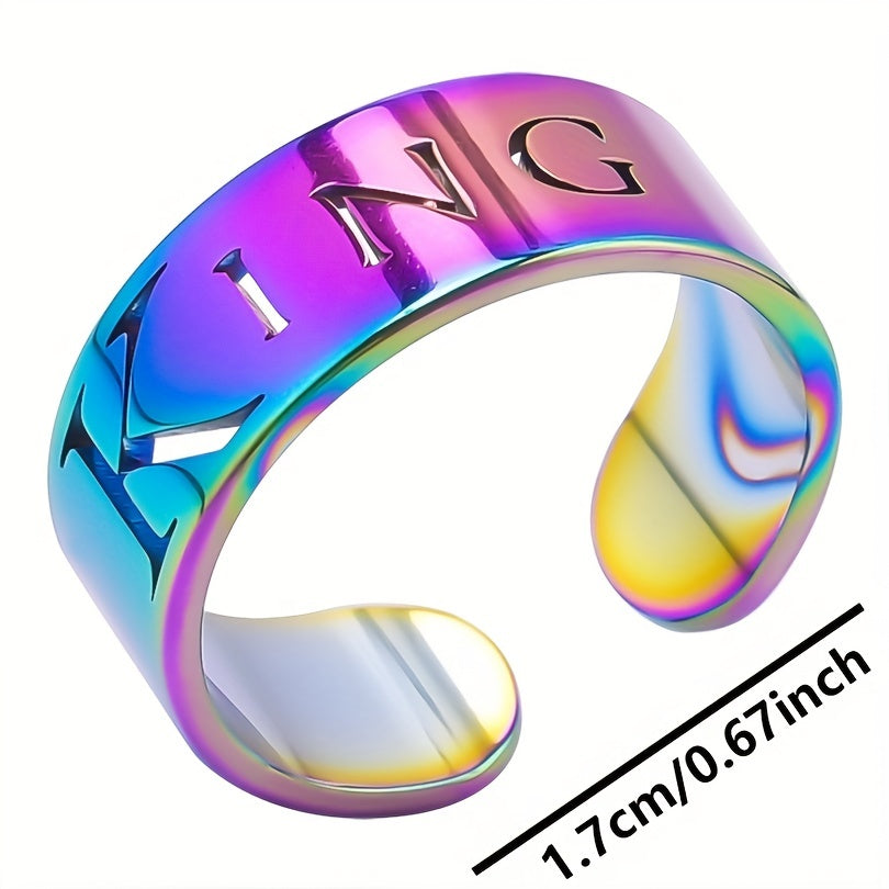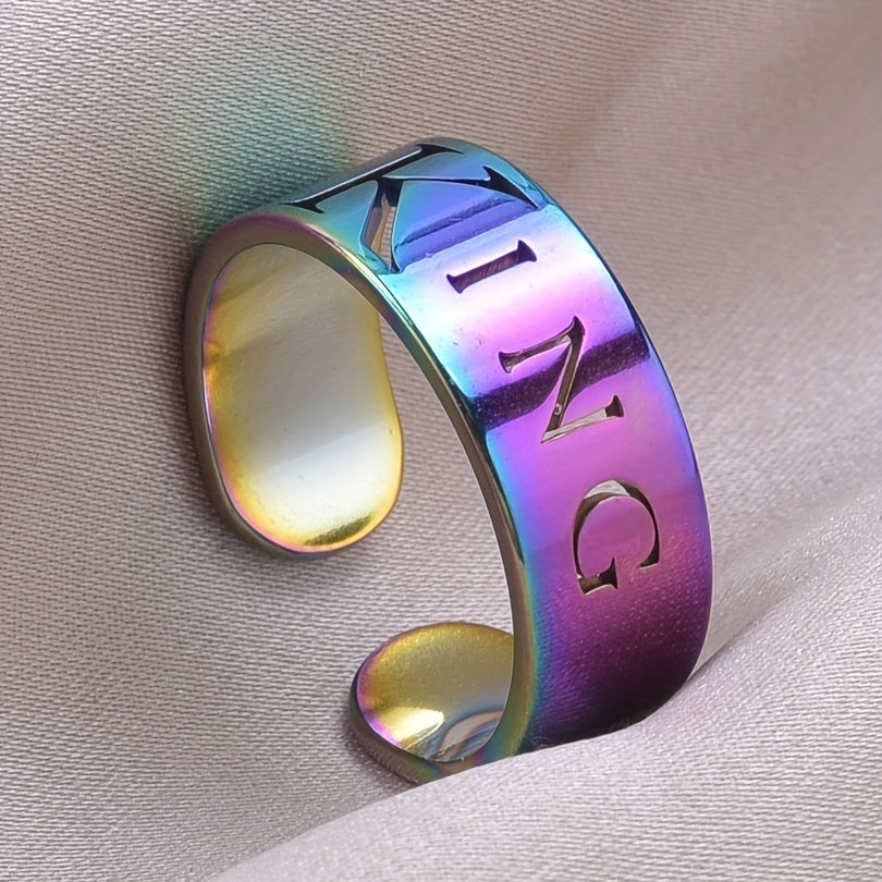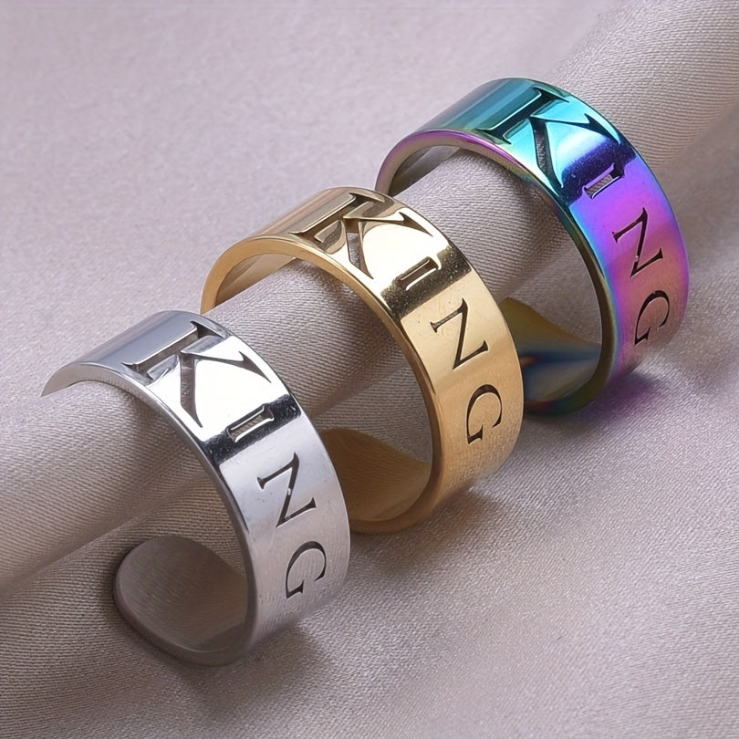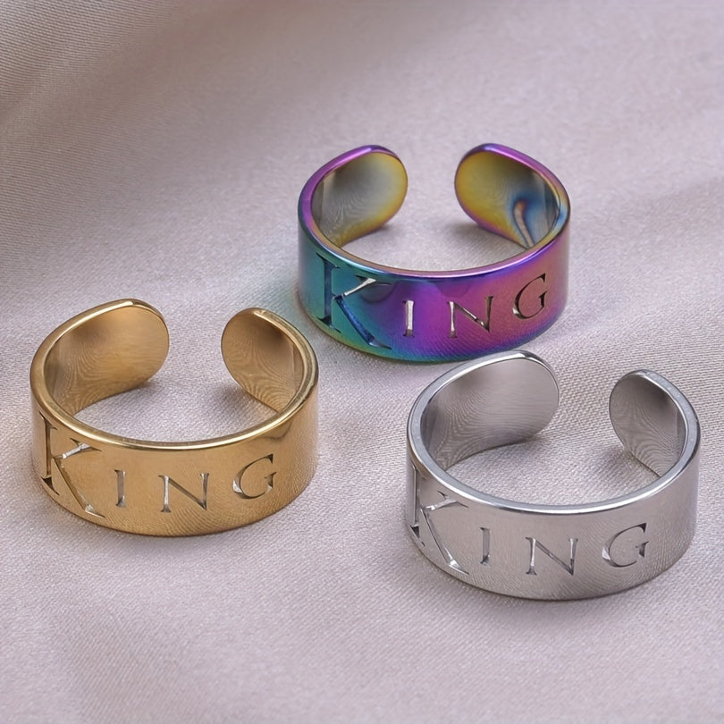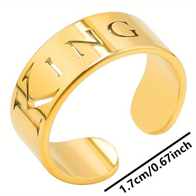 This wide cuff ring features a carved 'king' symbol, representing power and energy. It is made of stainless steel with 18k gold plating, perfect for Halloween, Christmas, or party accessory.