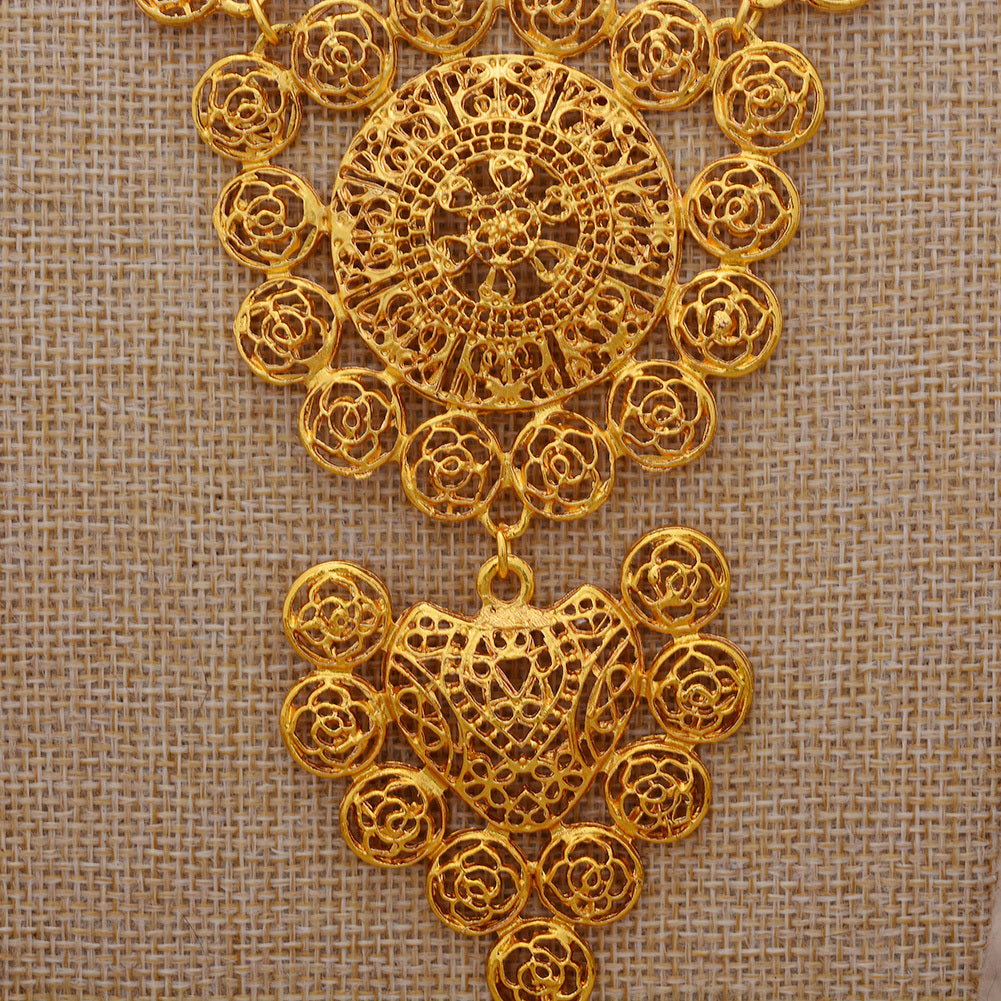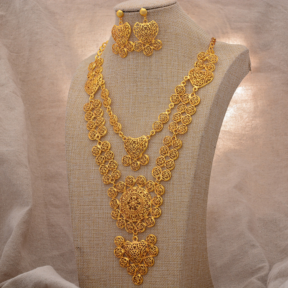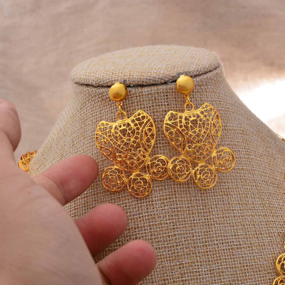 This stunning 18K plated jewelry set features a pendant necklace and dangle earrings, crafted from high-quality zinc alloy. Perfect for adding a touch of elegance to any outfit.