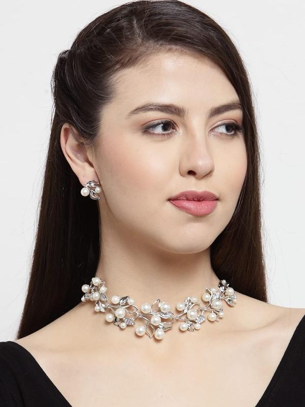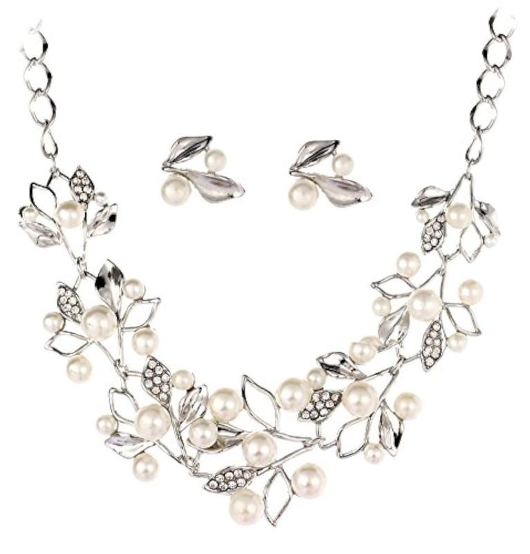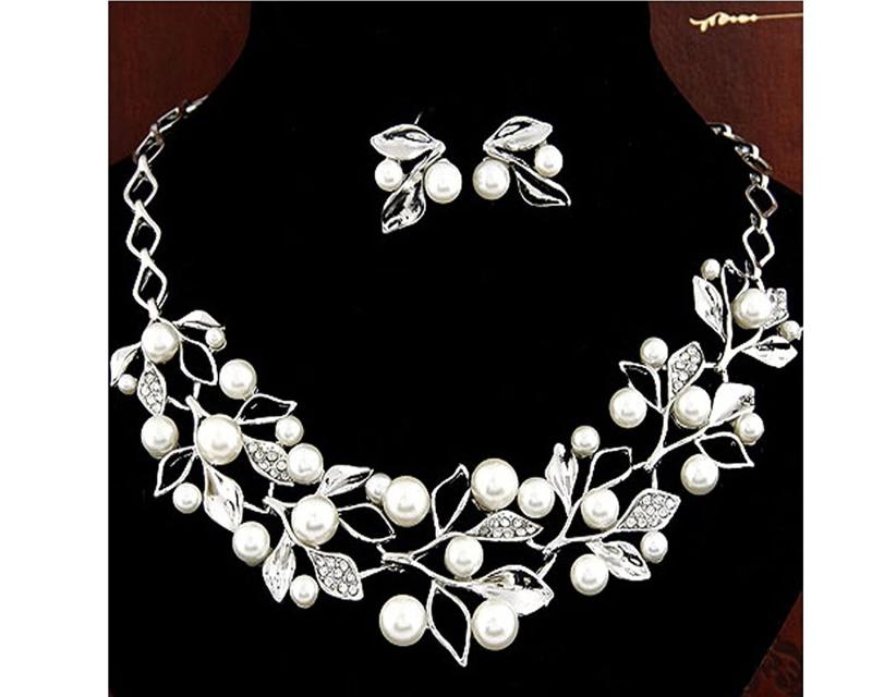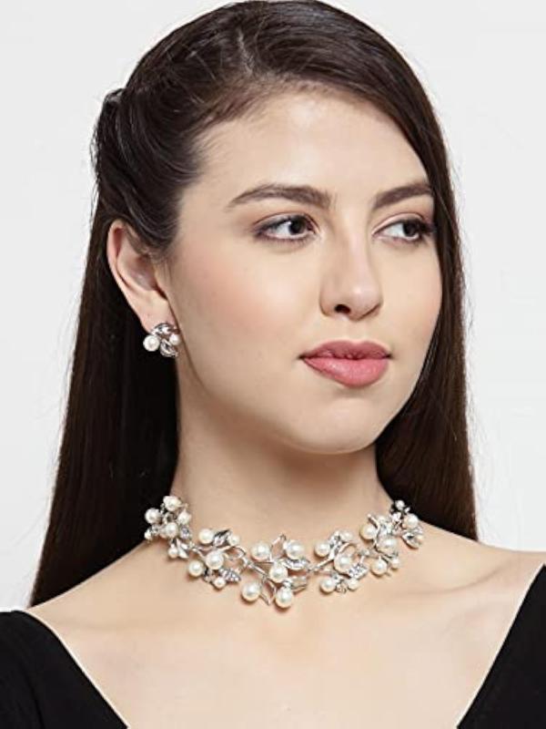 Elegant jewellery set featuring a pearl necklace and matching fancy earrings for girls and women.