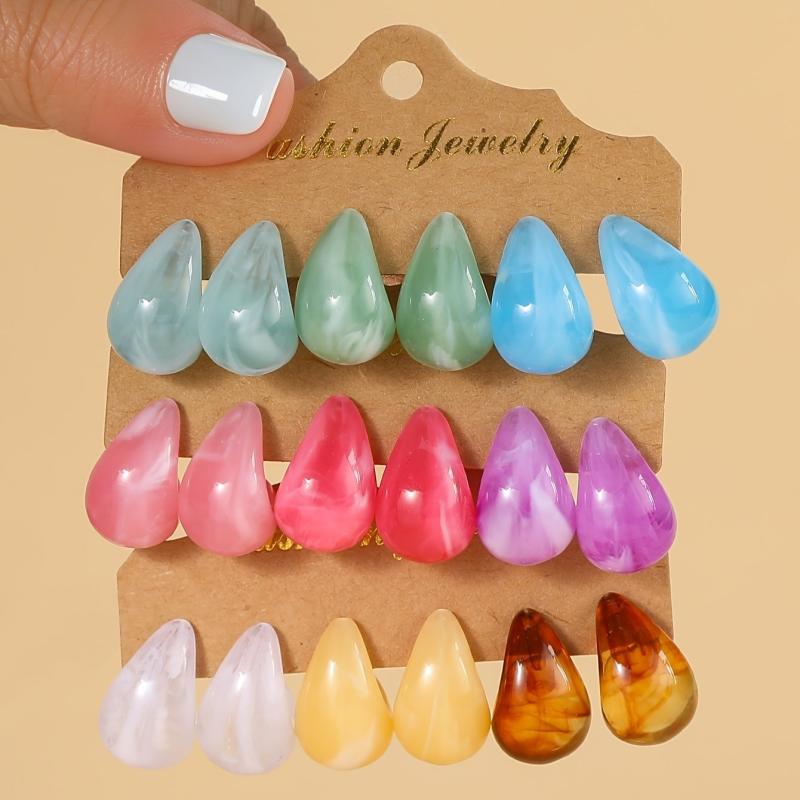 Add a pop of color to your outfit with this set of 18 candy-colored water drop earrings. Made of lightweight acrylic and stainless steel, they are perfect for everyday wear.