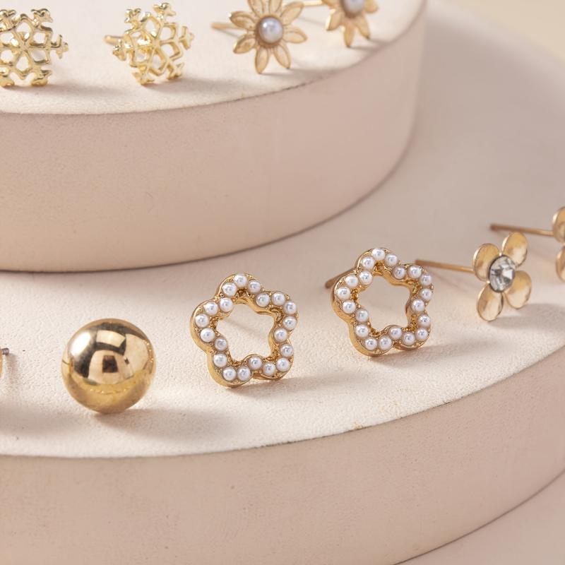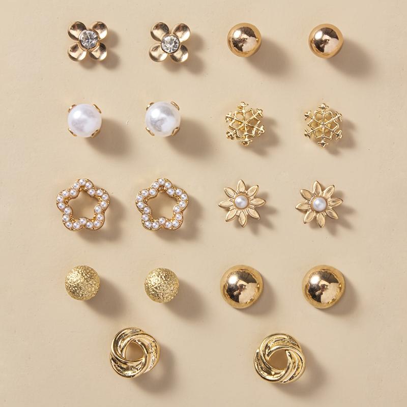 Add a touch of glamour to your look with this set of 18 geometric earrings. Made of golden plated zinc alloy with sparkling rhinestones, perfect for daily wear or special occasions. Great gift for Valentine's Day or any season.