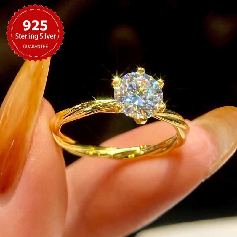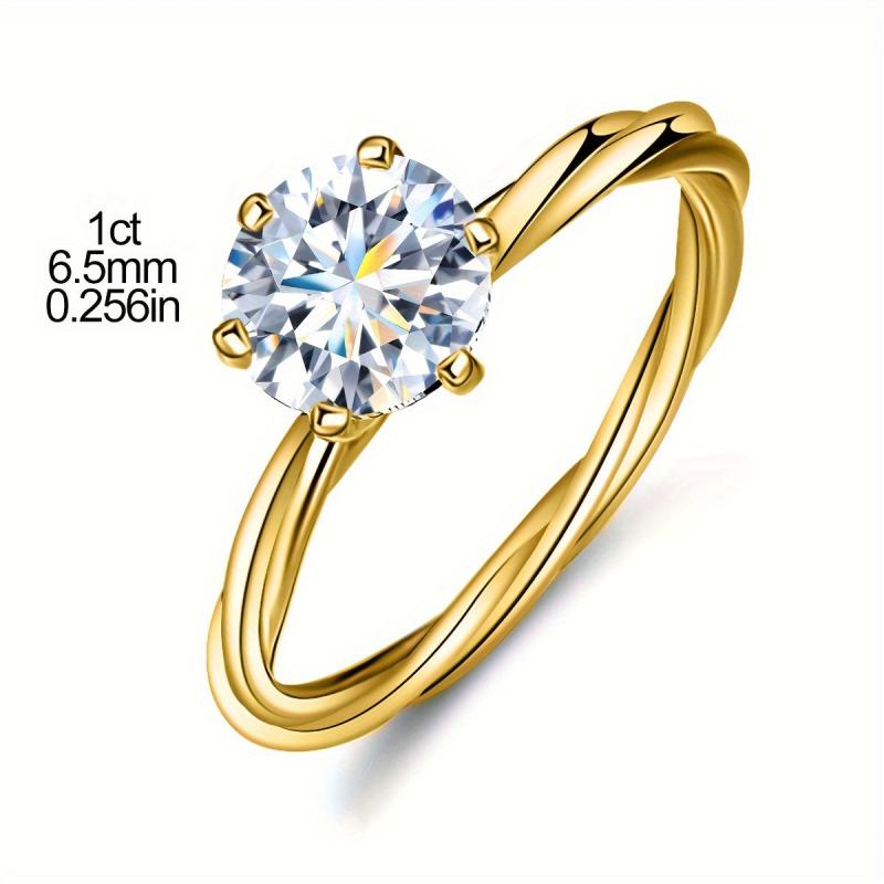 This elegant engagement ring features a 1ct round cut Moissanite stone in a 6 prong setting, plated with 18K gold over 925 silver. Perfect for all seasons and makes a thoughtful gift for anniversaries.