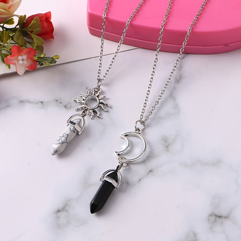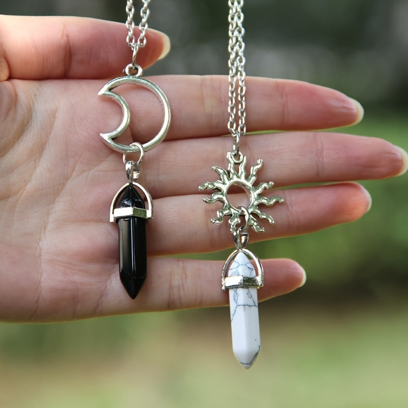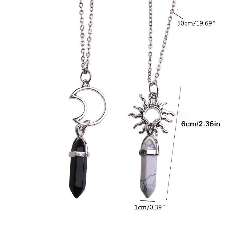 Elevate your style with this 2-pack vintage sun moon necklace featuring a two-tone hexagon crystal pendant. Perfect for adding a touch of celestial charm to any outfit.