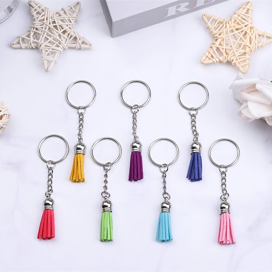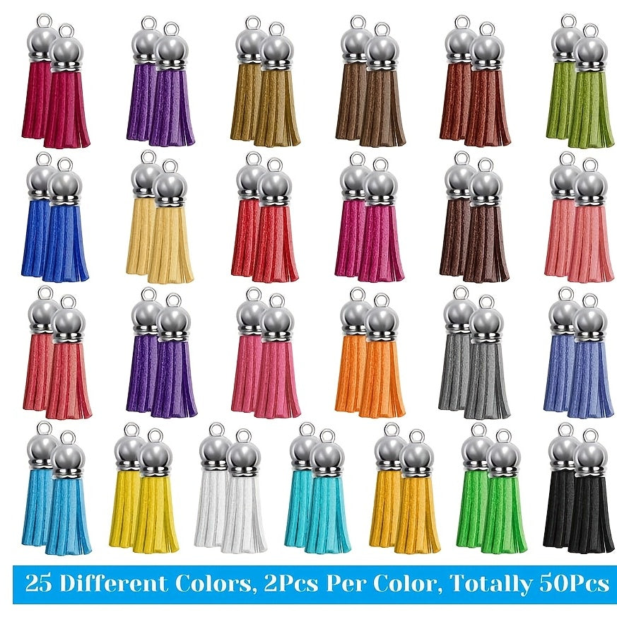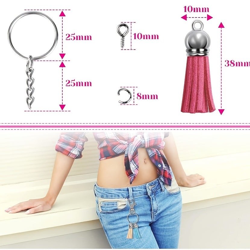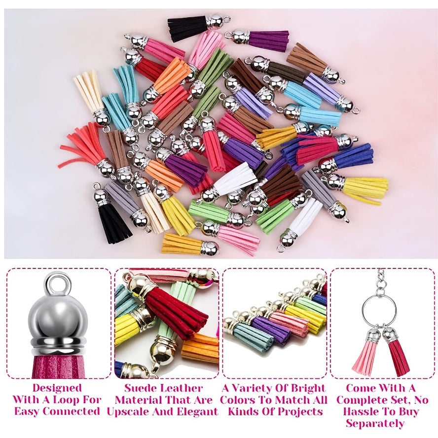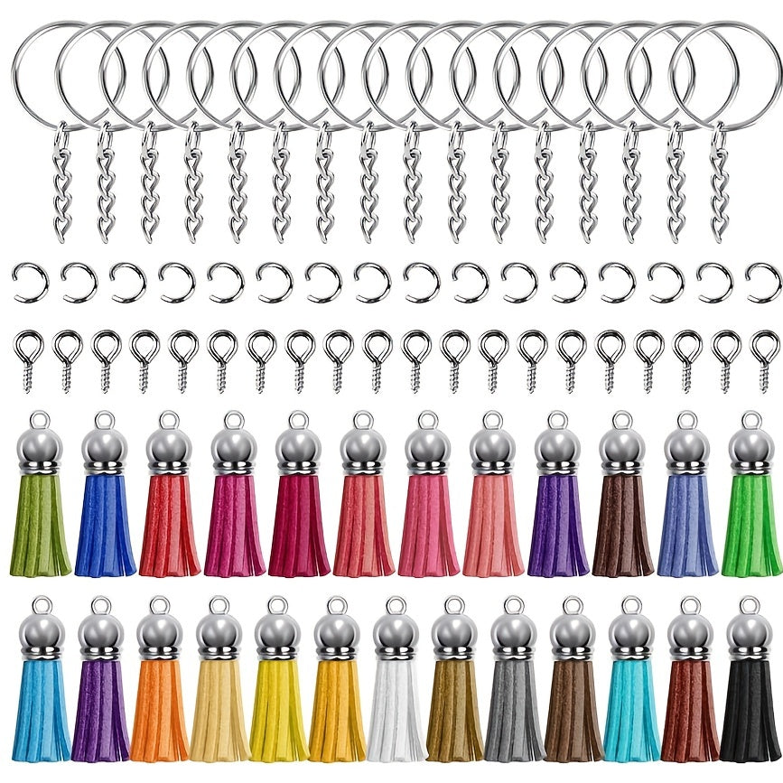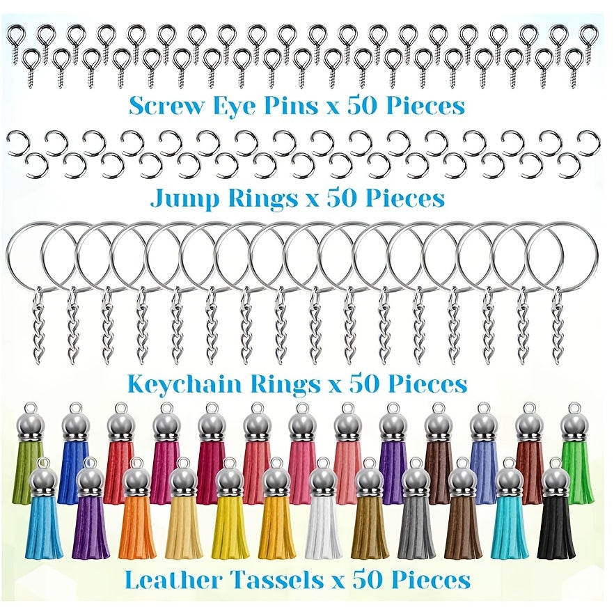 This keychain tassels set includes 50 tassels, 50 key chain rings, 50 jump rings, and 50 screw eye pins. Perfect for crafts and DIY projects.