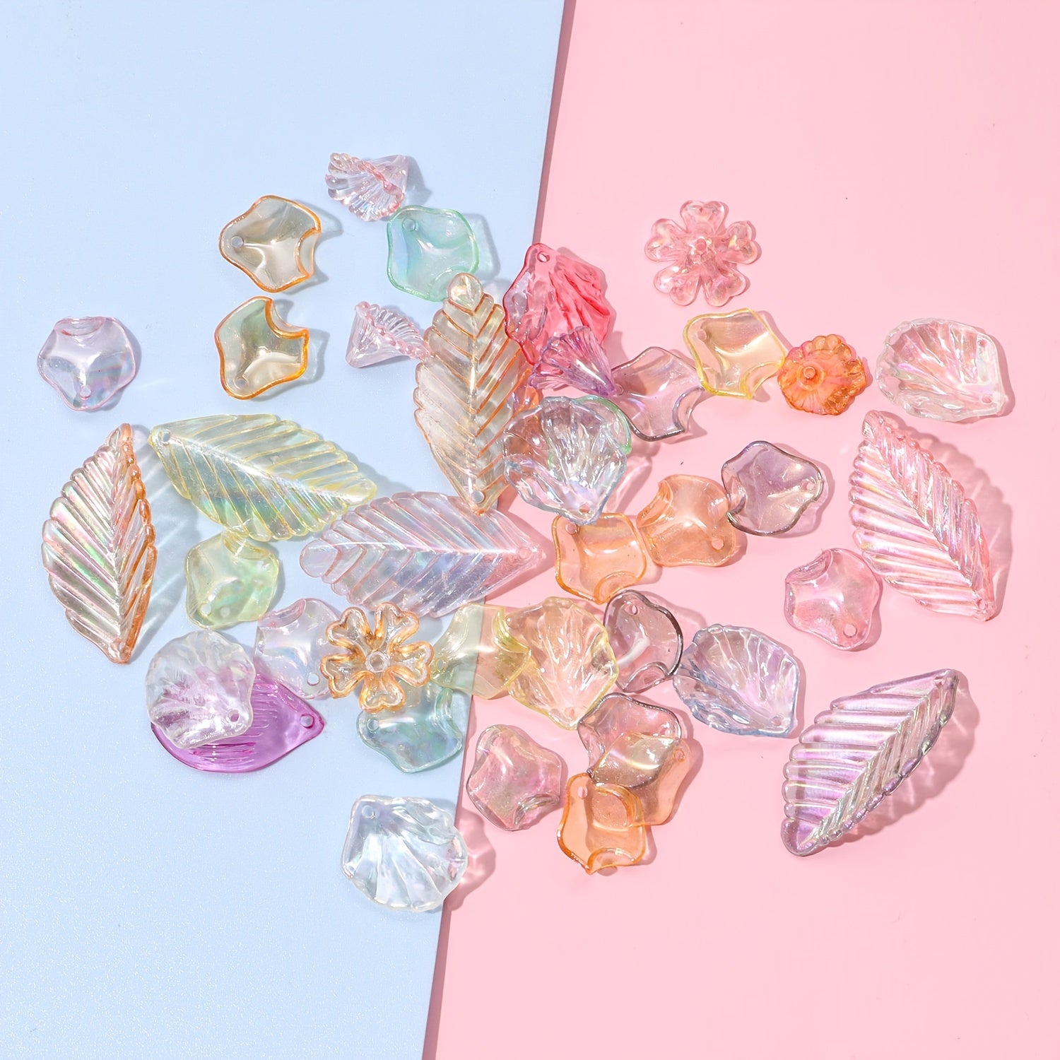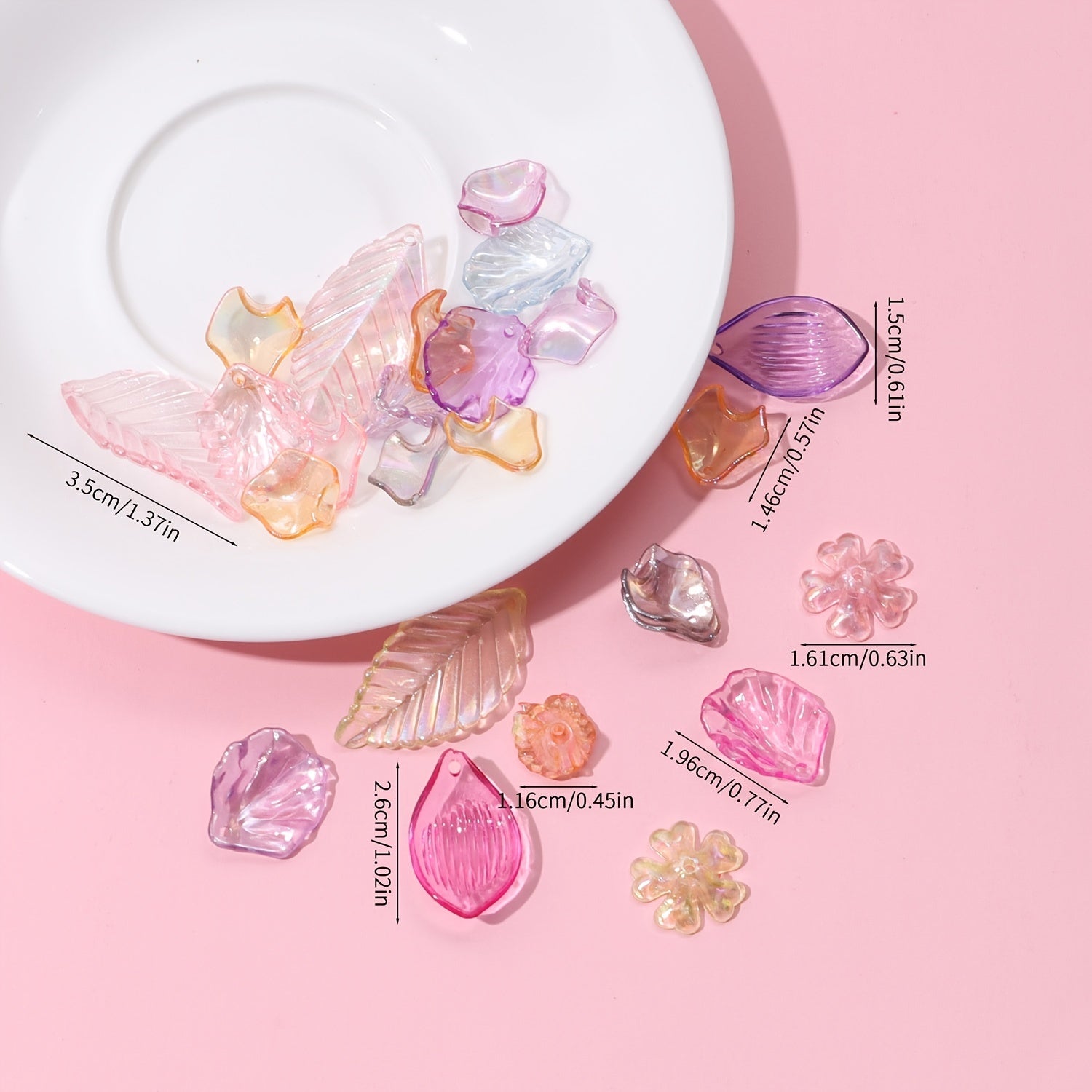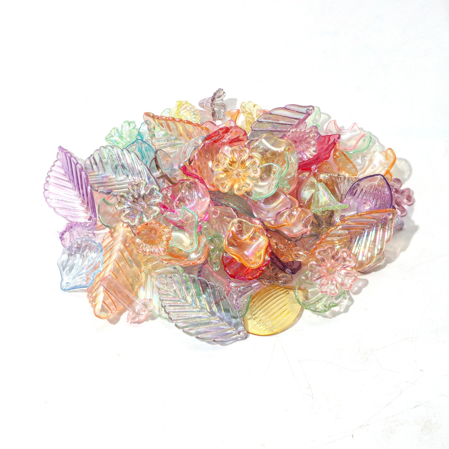 This 20g pack contains a random mix of transparent acrylic clear leaves and flowers, perfect for jewelry making and crafts.