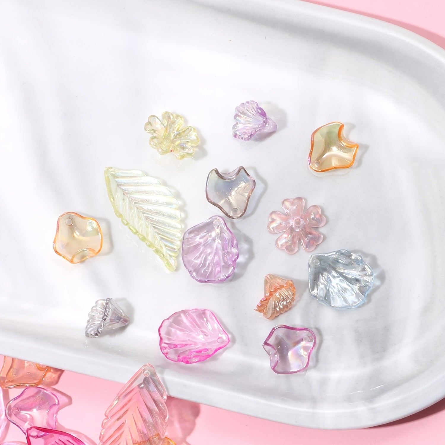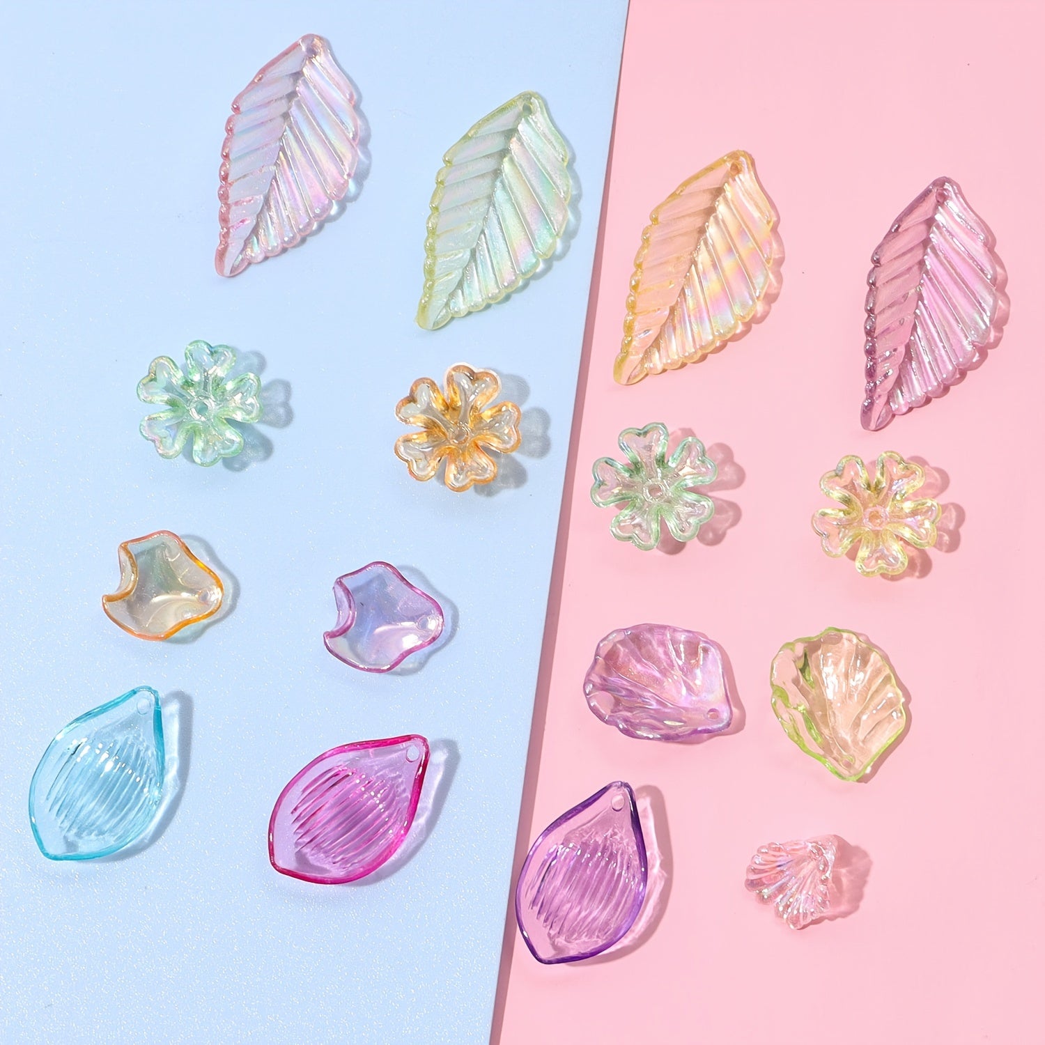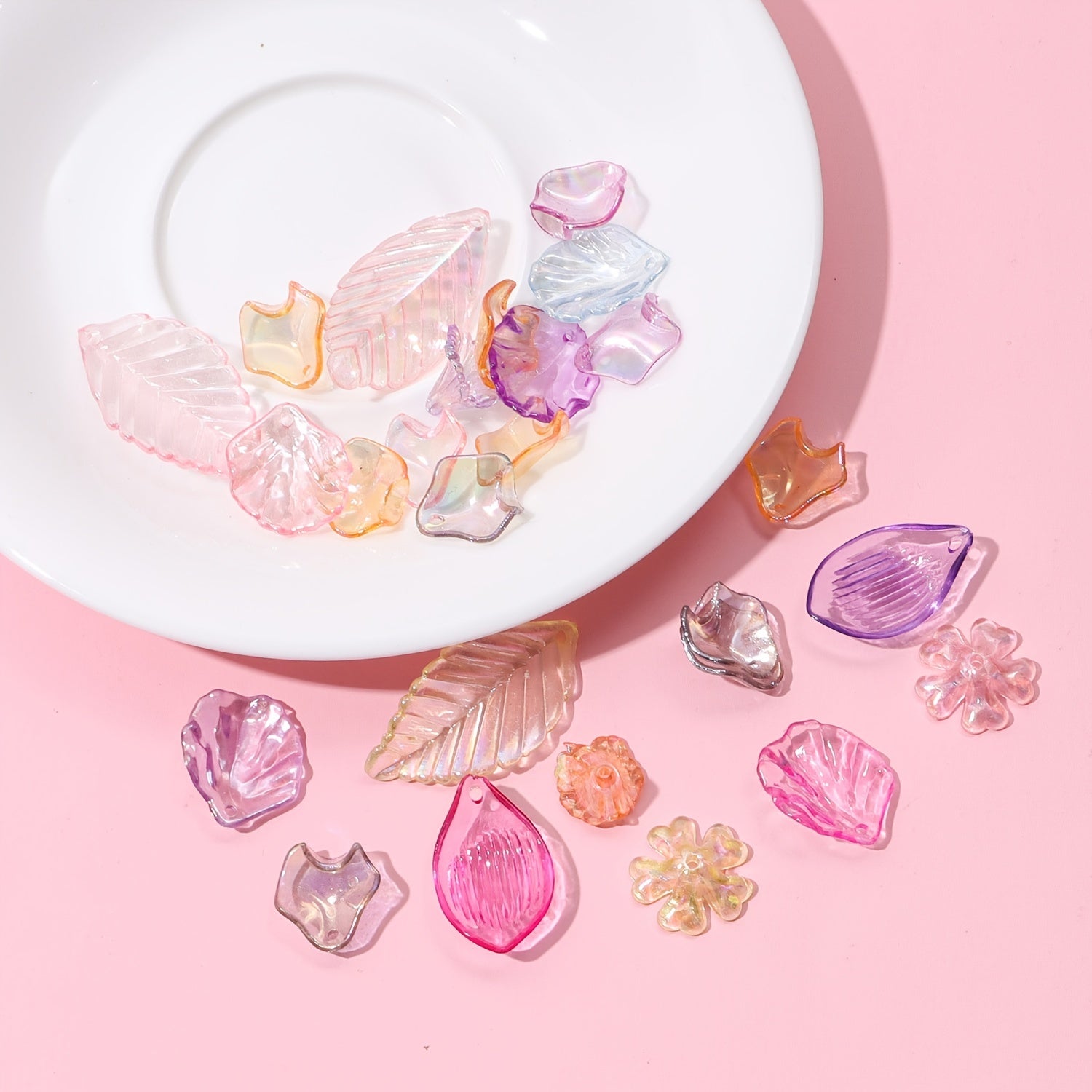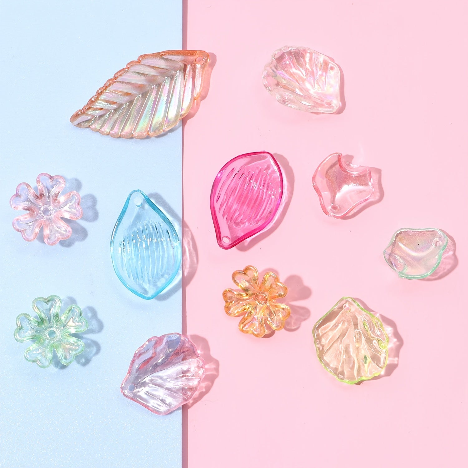 This 20g pack contains a random mix of transparent acrylic clear leaves and flowers, perfect for jewelry making and crafts.
