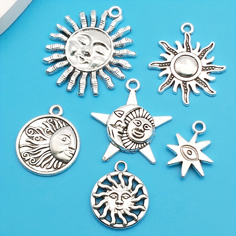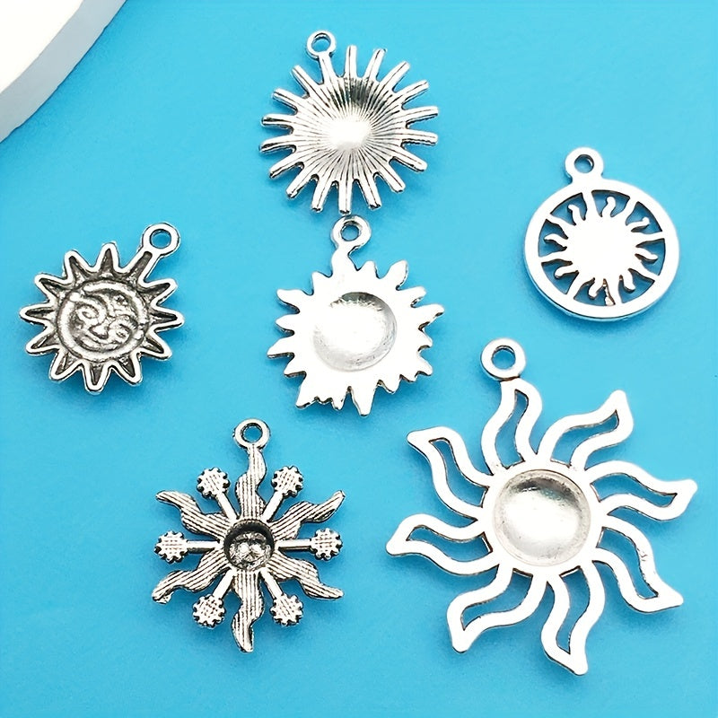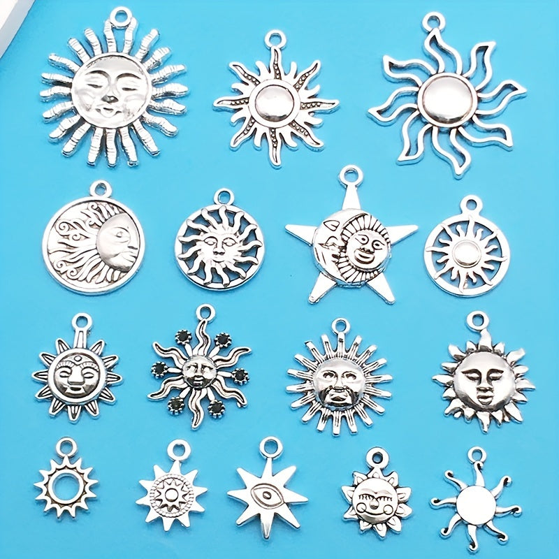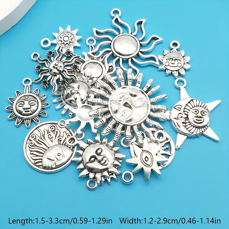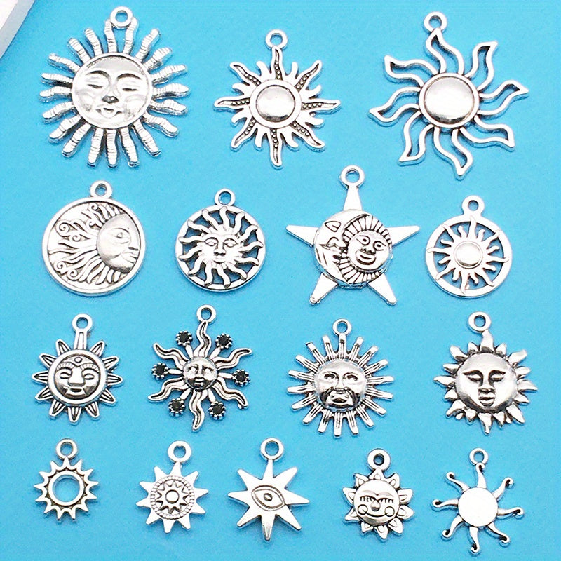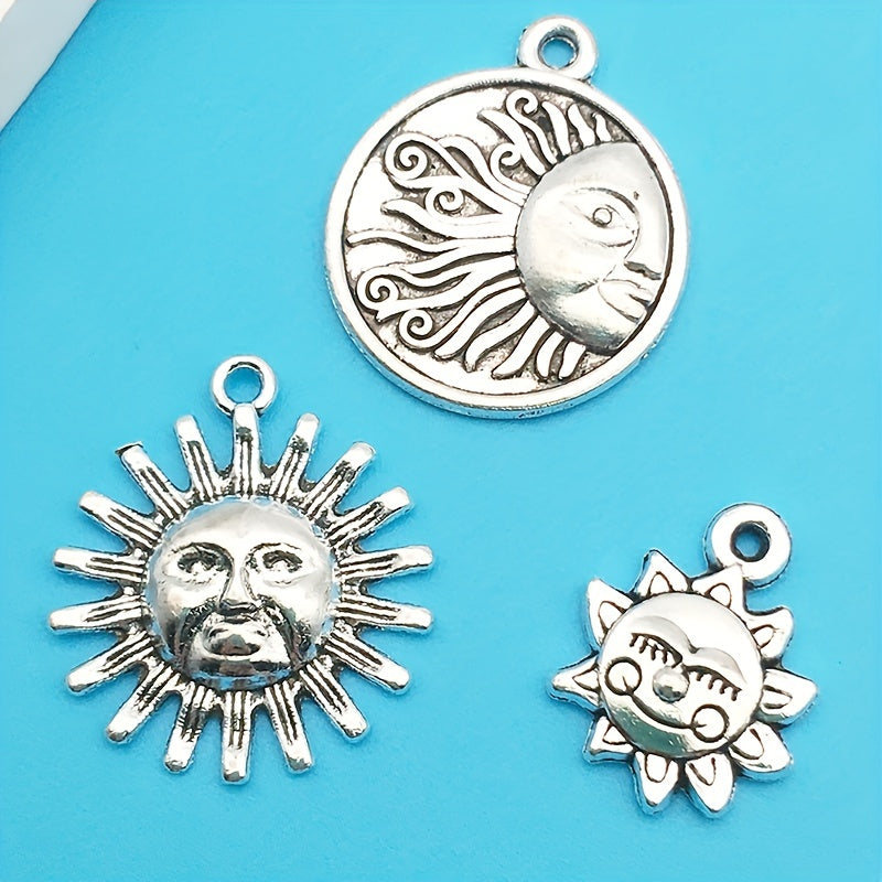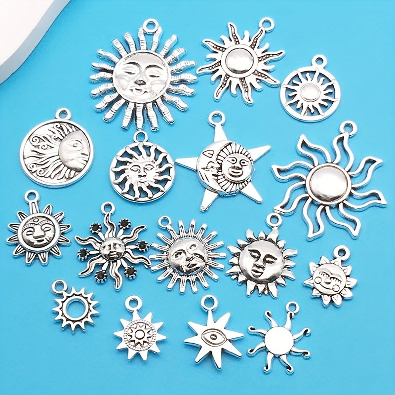 Enhance your jewelry making with these 20pcs zinc alloy charms in sun shape. Perfect for creating unique necklaces and bracelets. Each charm features an antique silver finish.