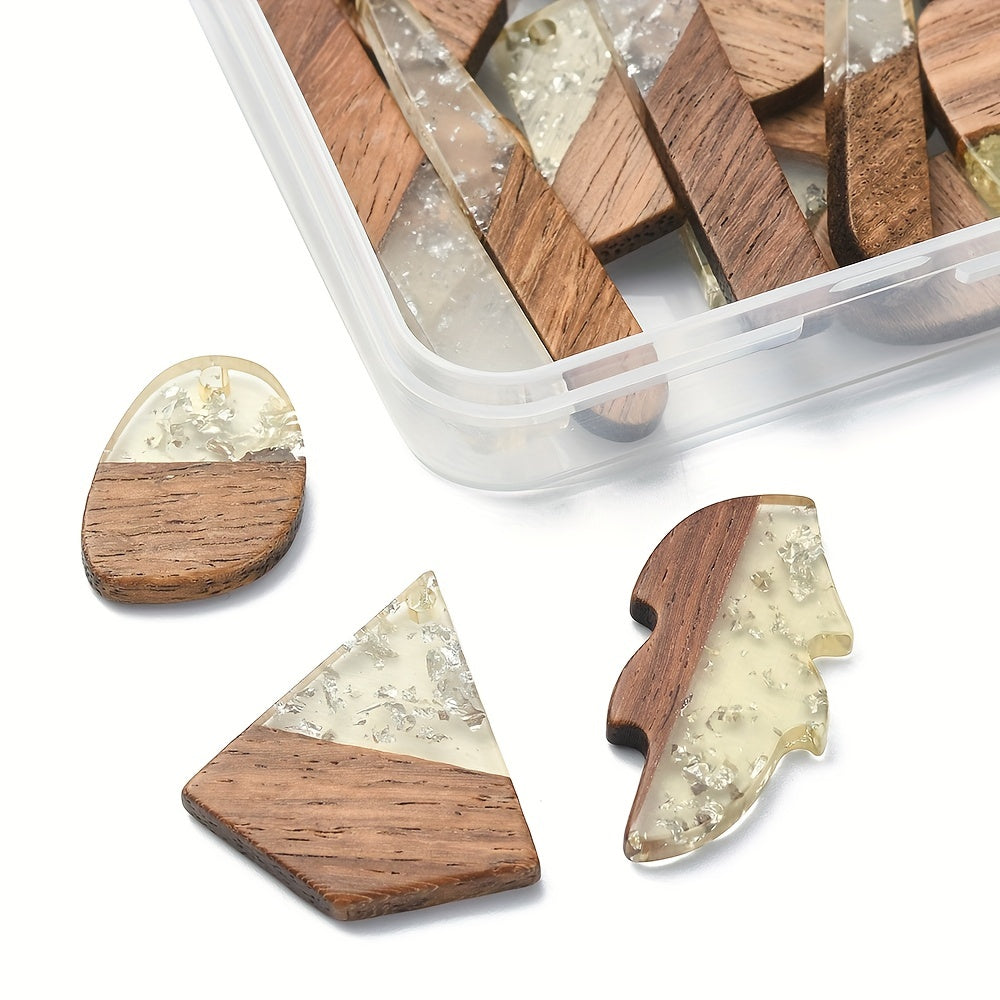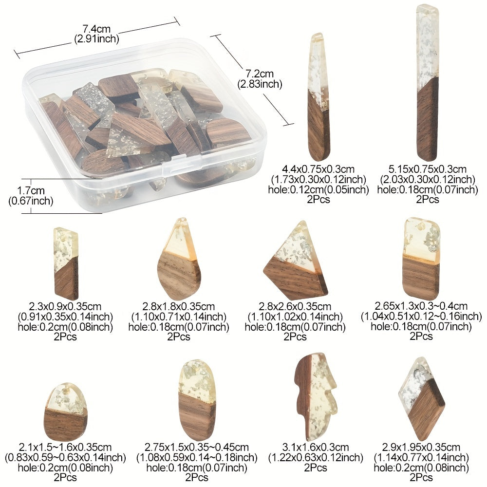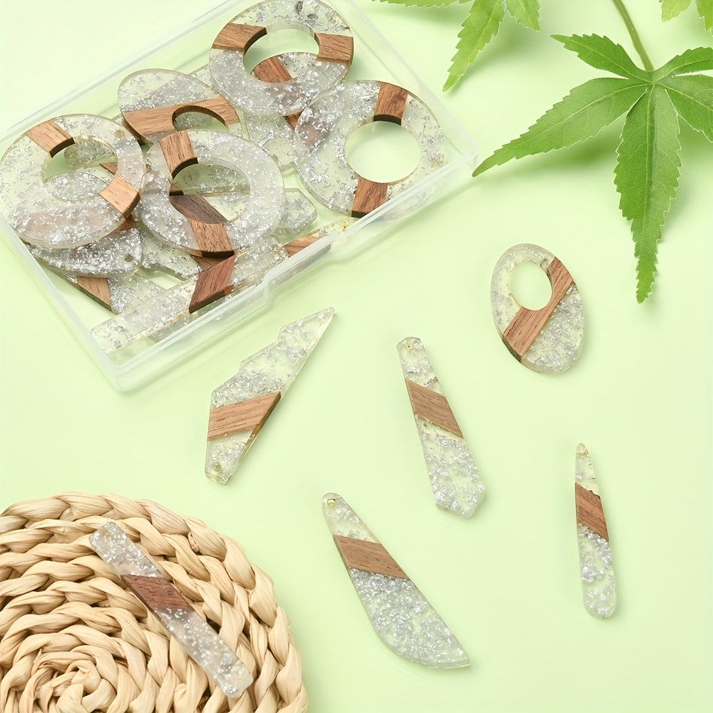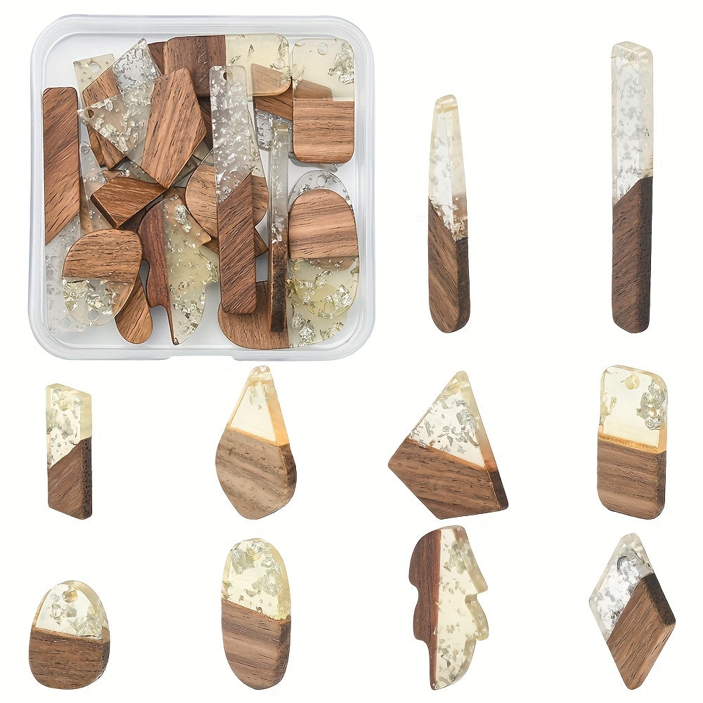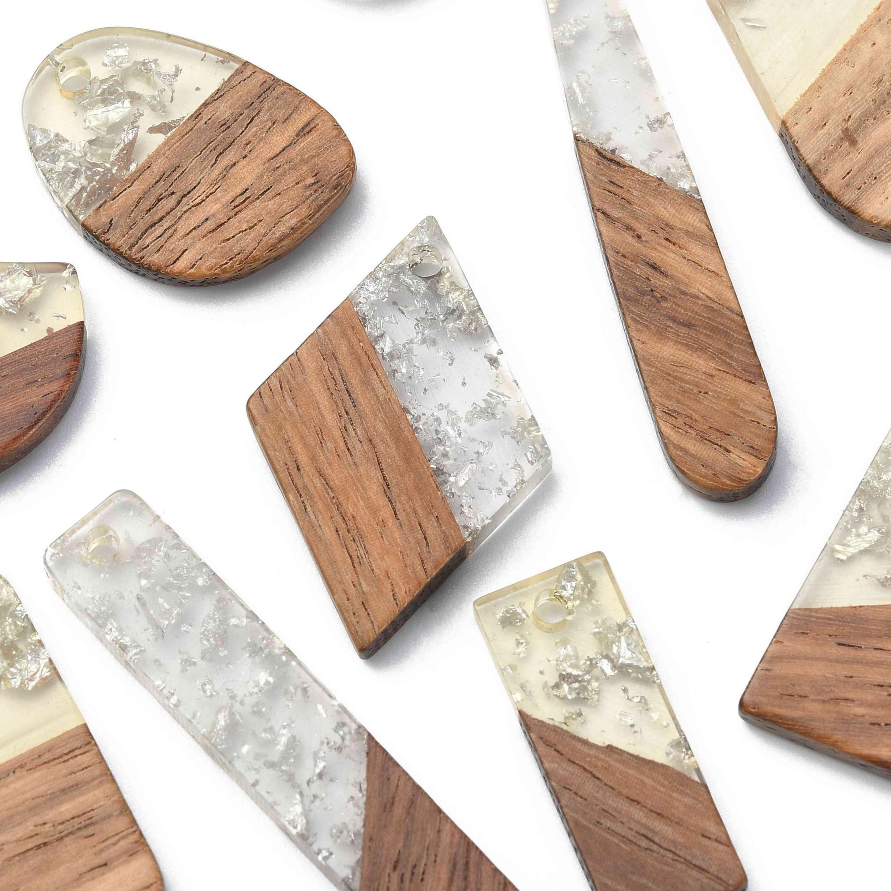 Explore your creativity with this set of 20 assorted walnut resin pendants in 10 different styles. Create unique earrings, bracelets, and necklaces with these versatile pendants.