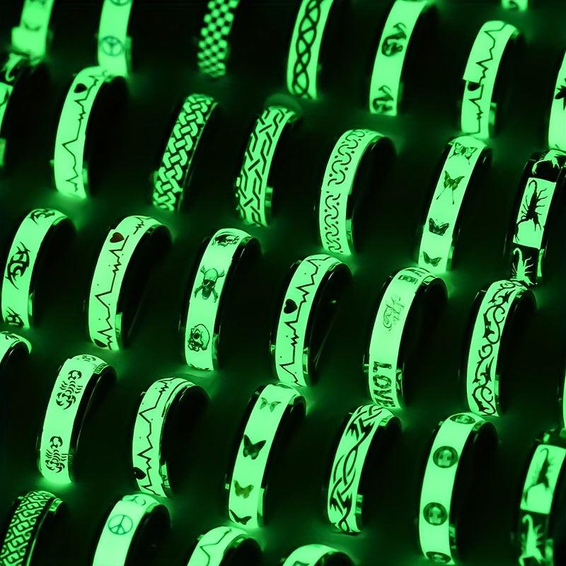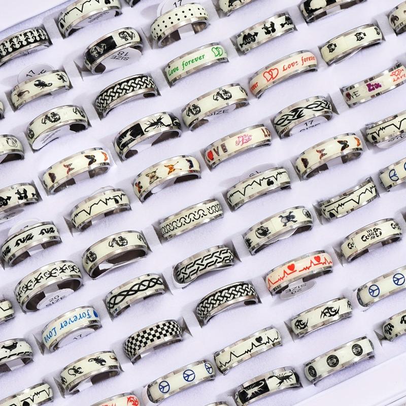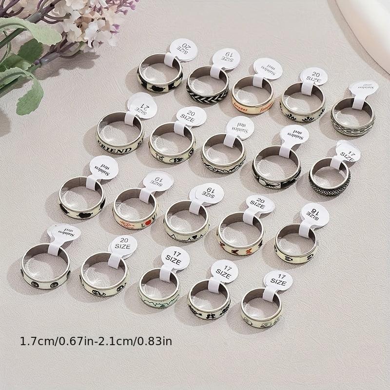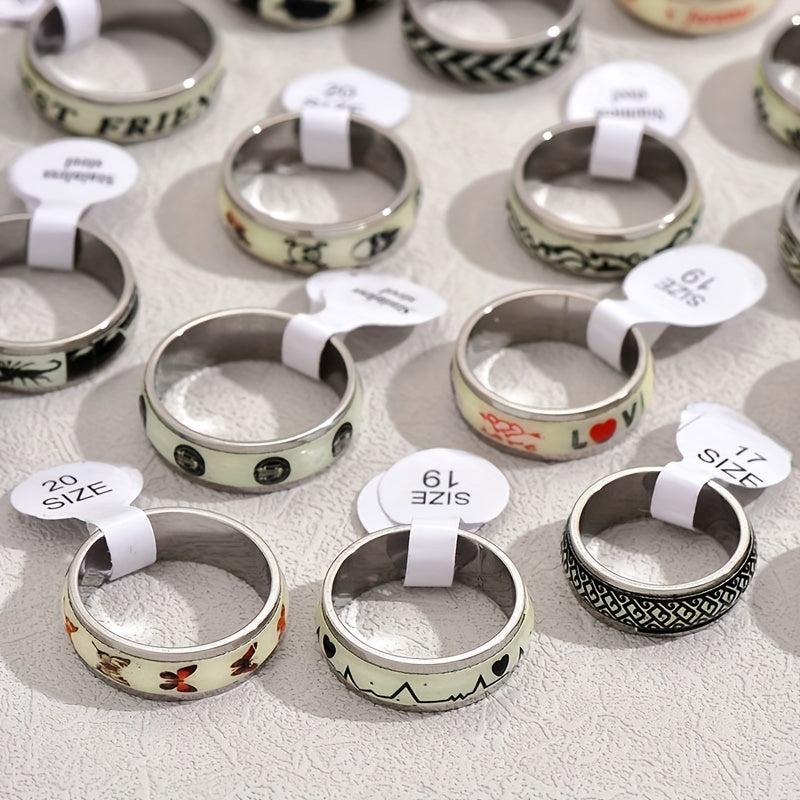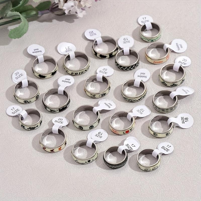 Enhance your style with this set of 20 assorted fluorescent stainless steel rings. The luminous design adds distinctive flair to any outfit.