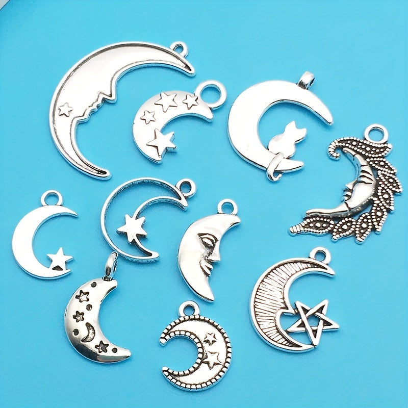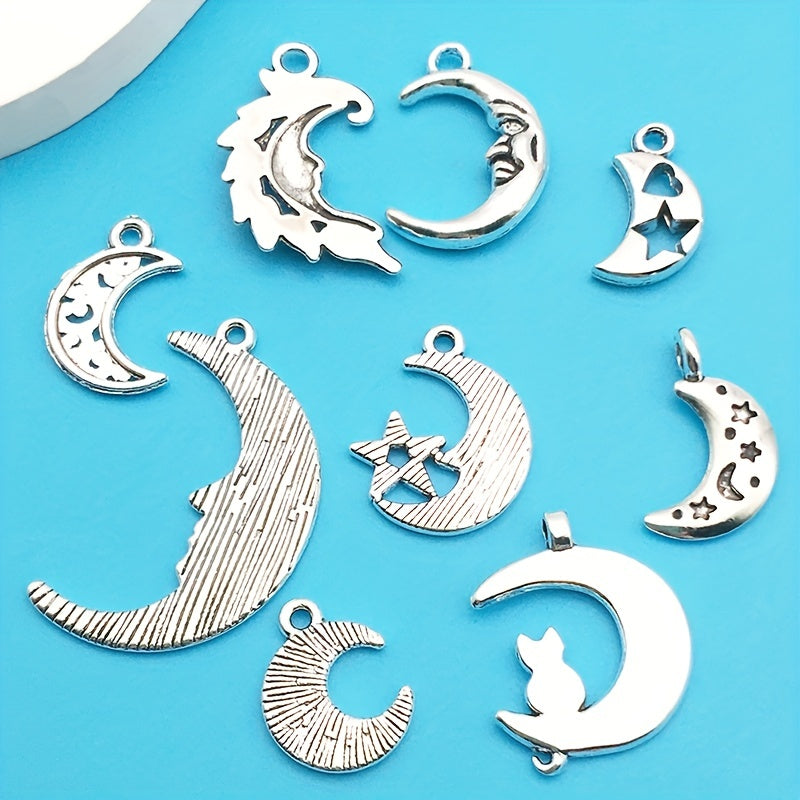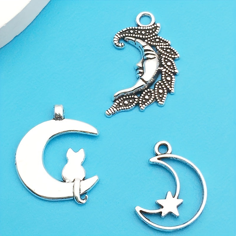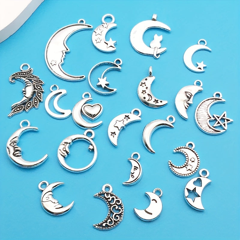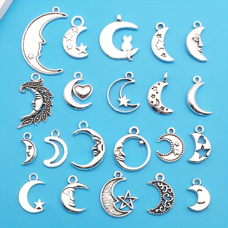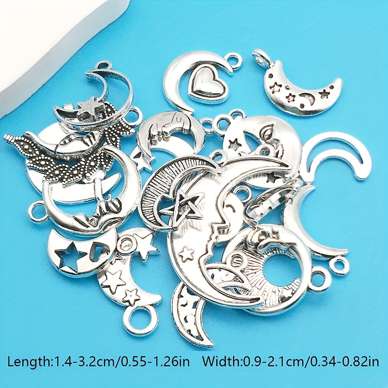 Enhance your jewelry making with this set of 20 moon-shaped charms. These antique silver charms are perfect for creating unique necklaces and bracelets. Made from zinc alloy, they are durable and stylish.