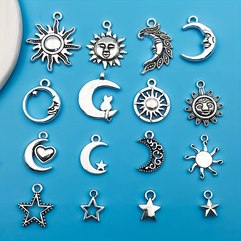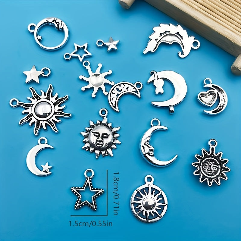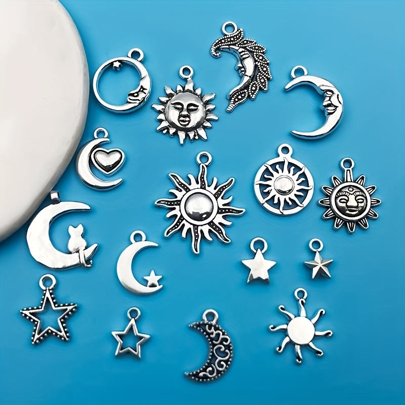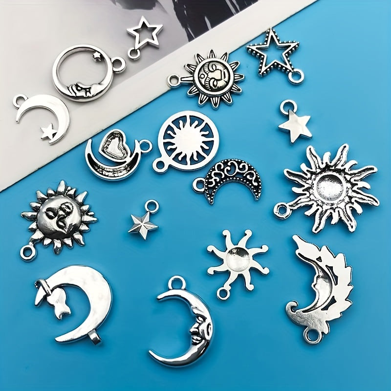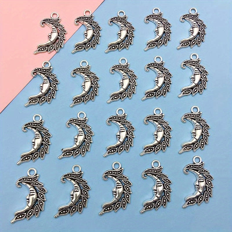 Create stunning jewelry pieces with this set of 20 moon and star shaped charms pendants. Made of zinc alloy in an antique silver finish, perfect for necklaces, bracelets, and earrings.