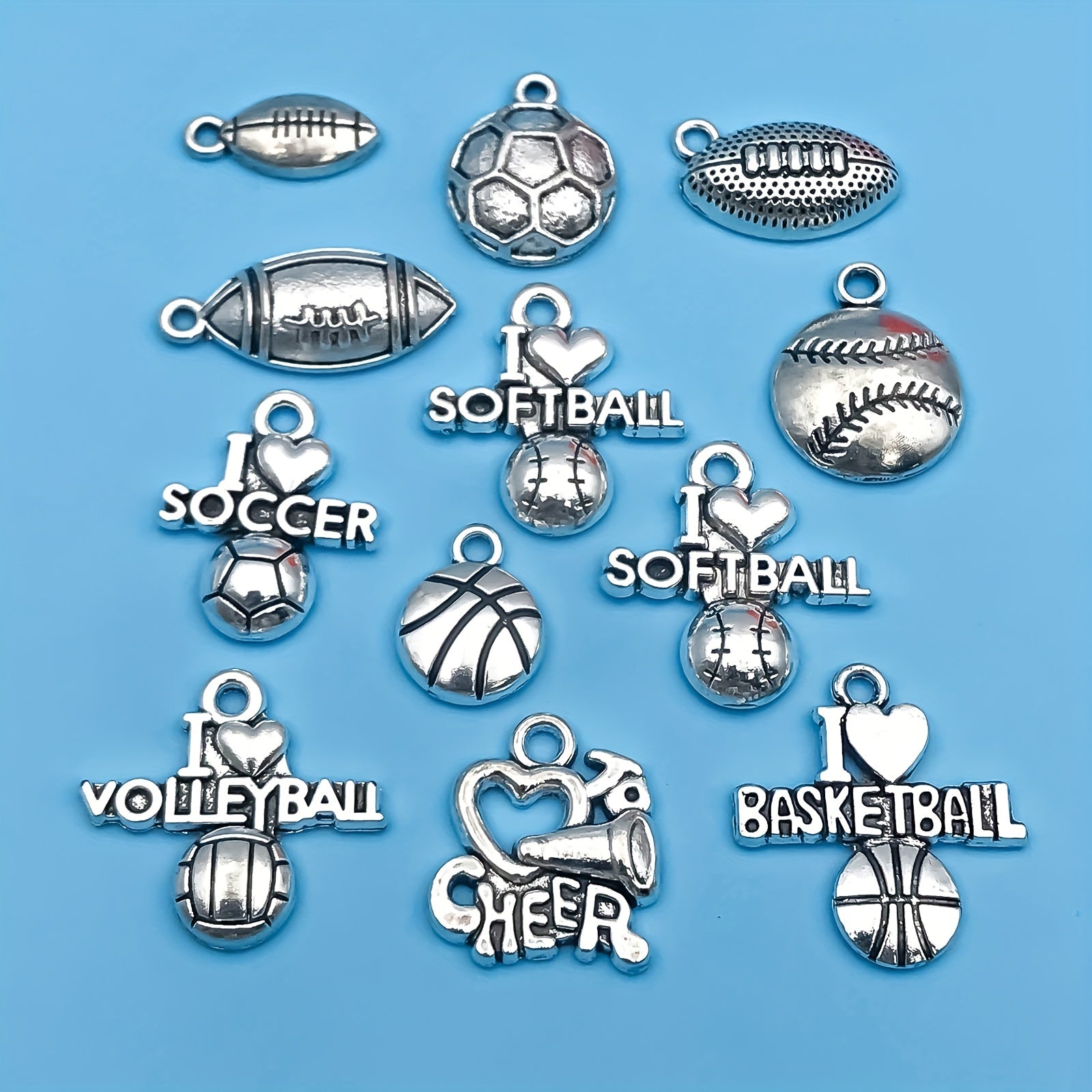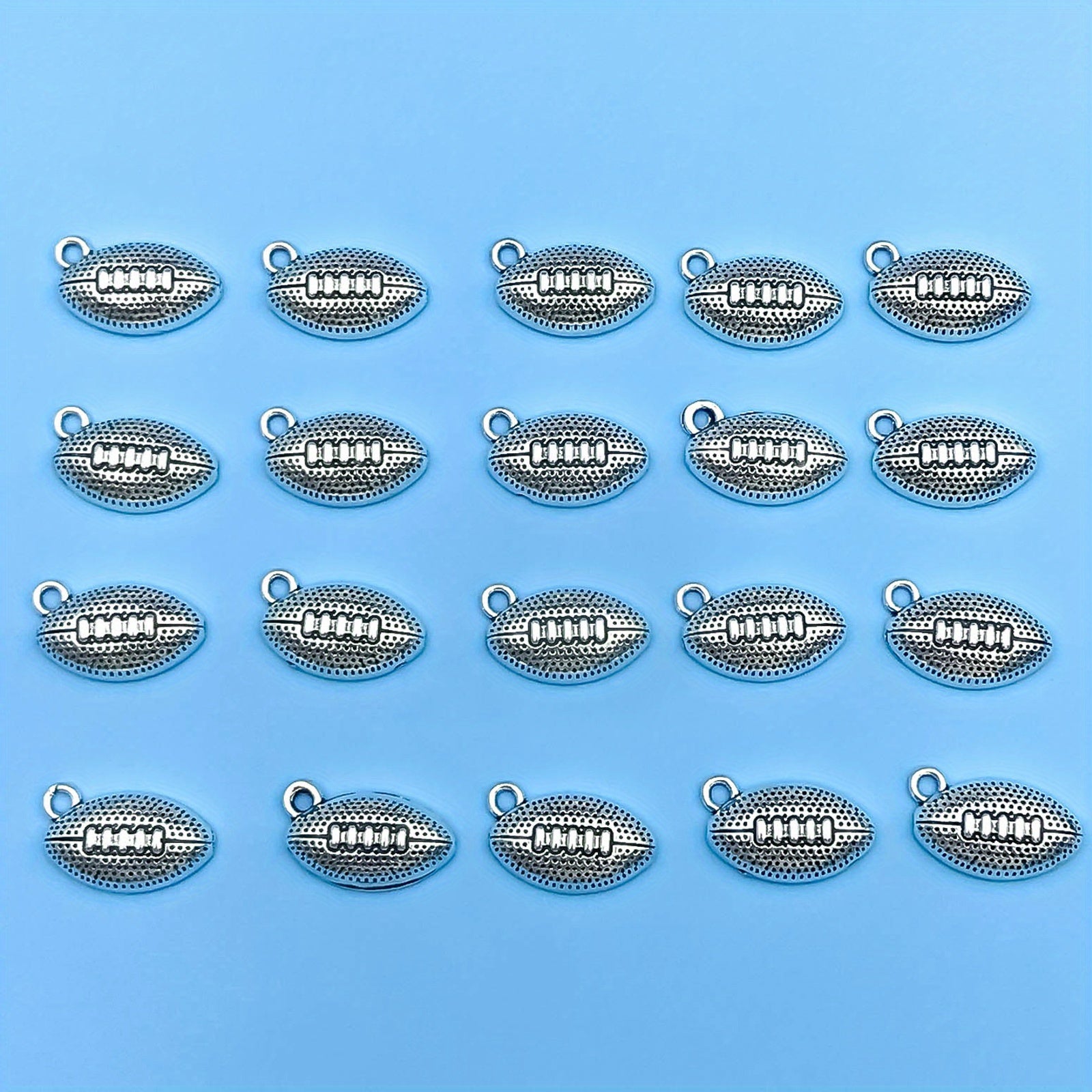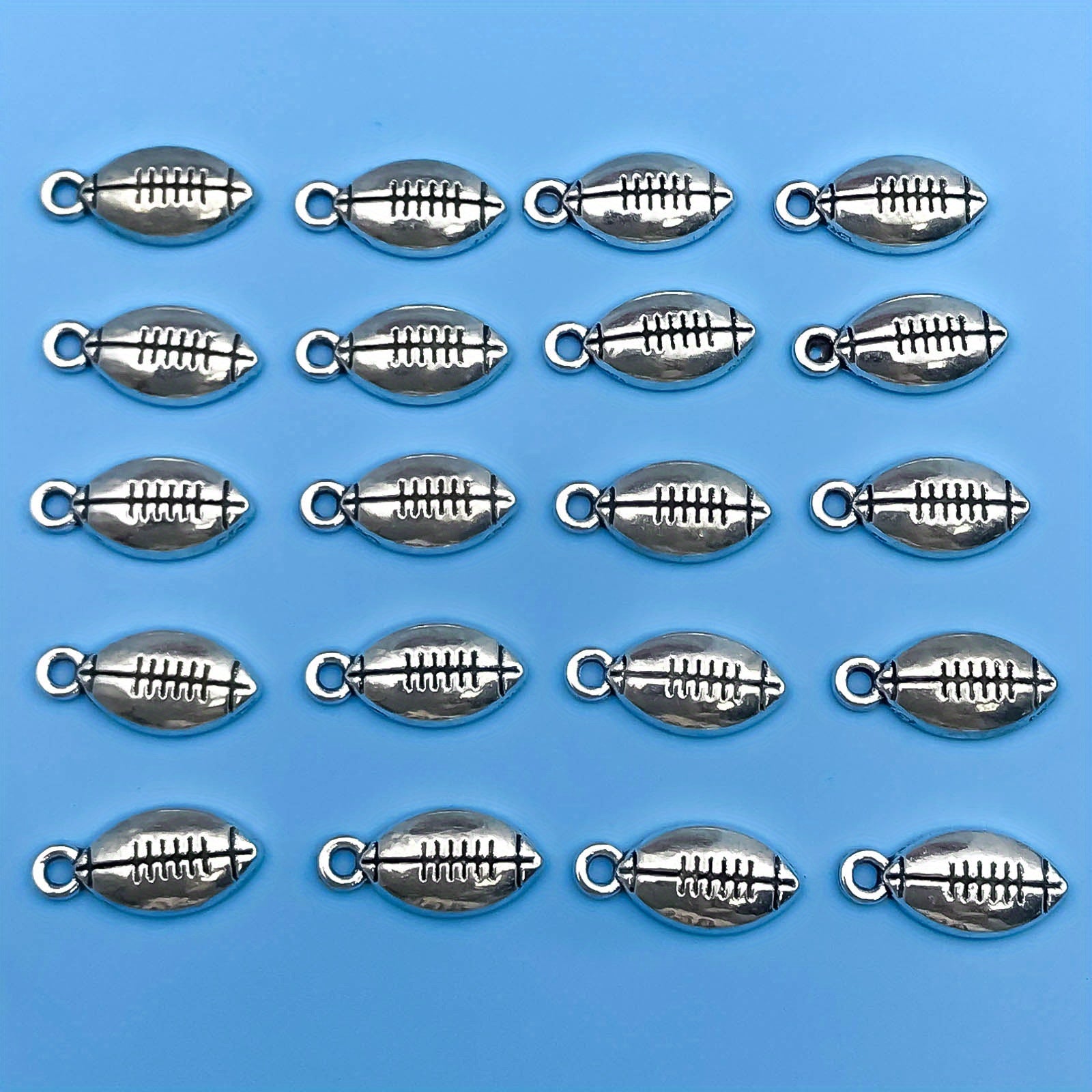 This set includes 20 pieces of zinc alloy charms in a sports theme, featuring American football, basketball, baseball, and rugby designs. Perfect for DIY projects like necklaces, bracelets, and jewelry making.