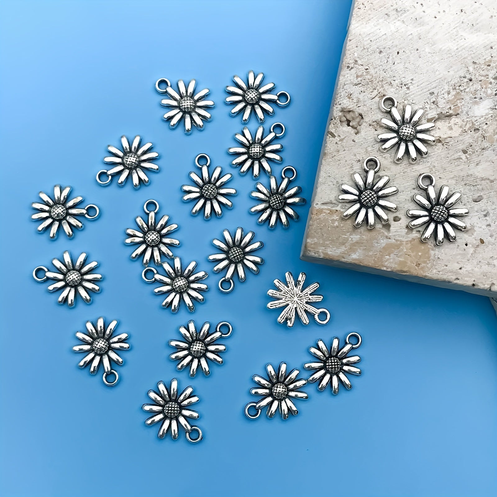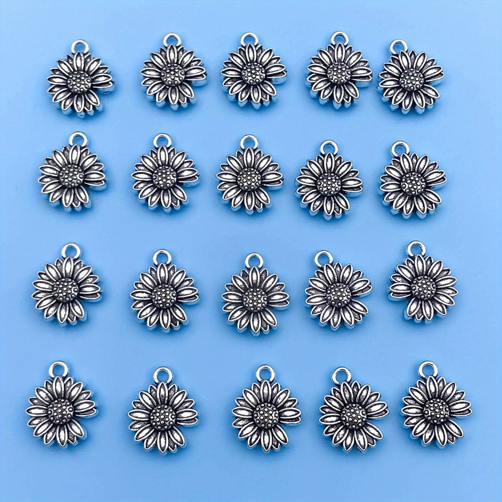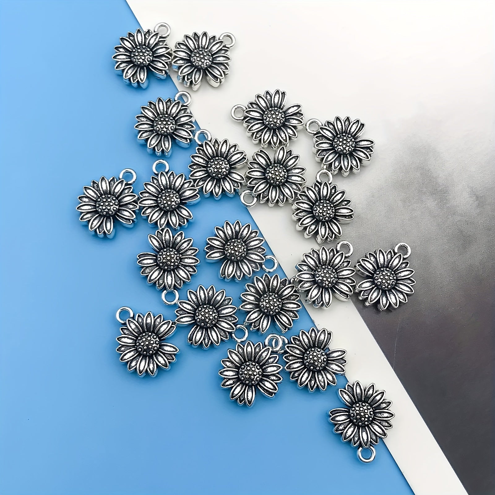 These antique silvery charms are shaped like sunflowers and little daisy flowers, perfect for crafting unique jewelry pieces.