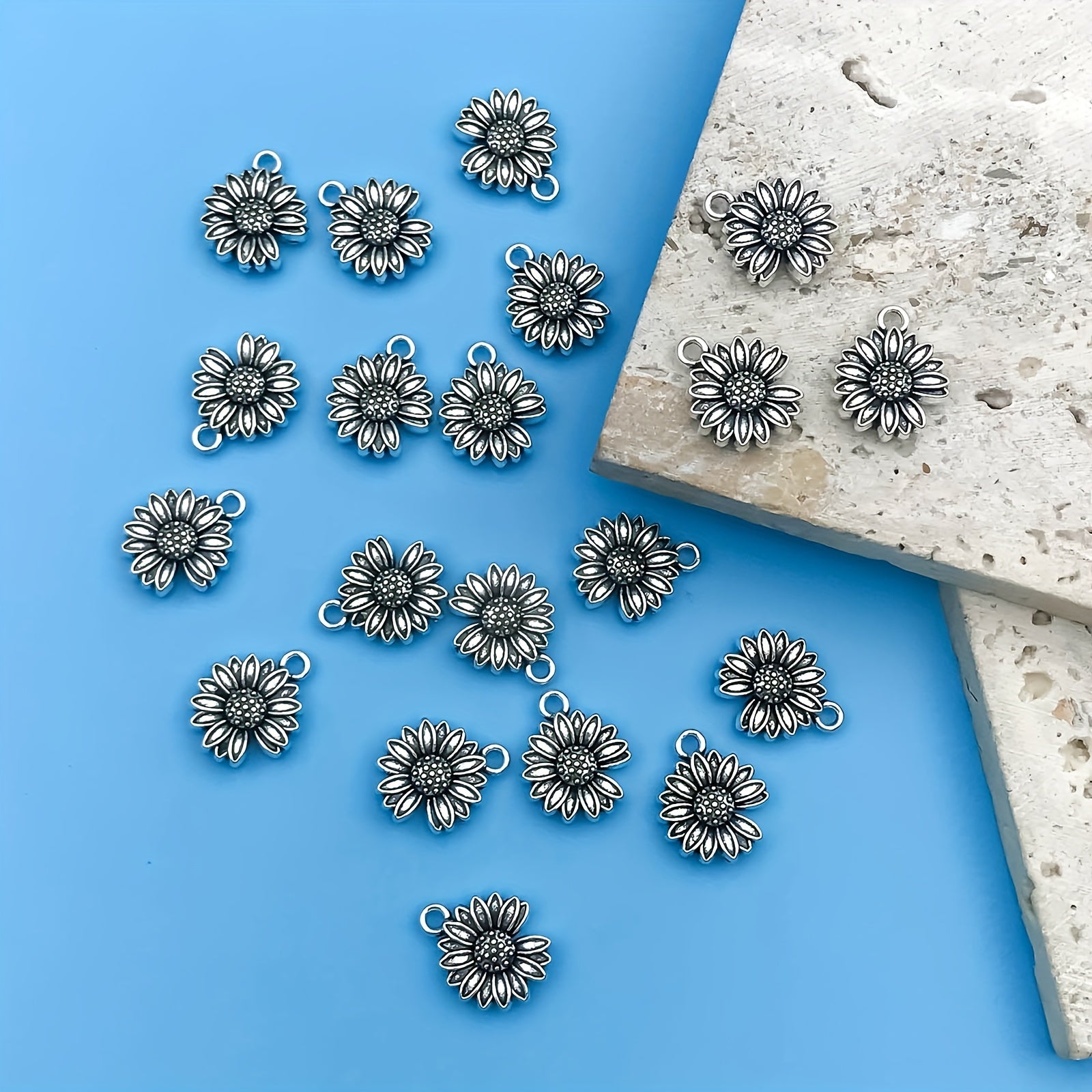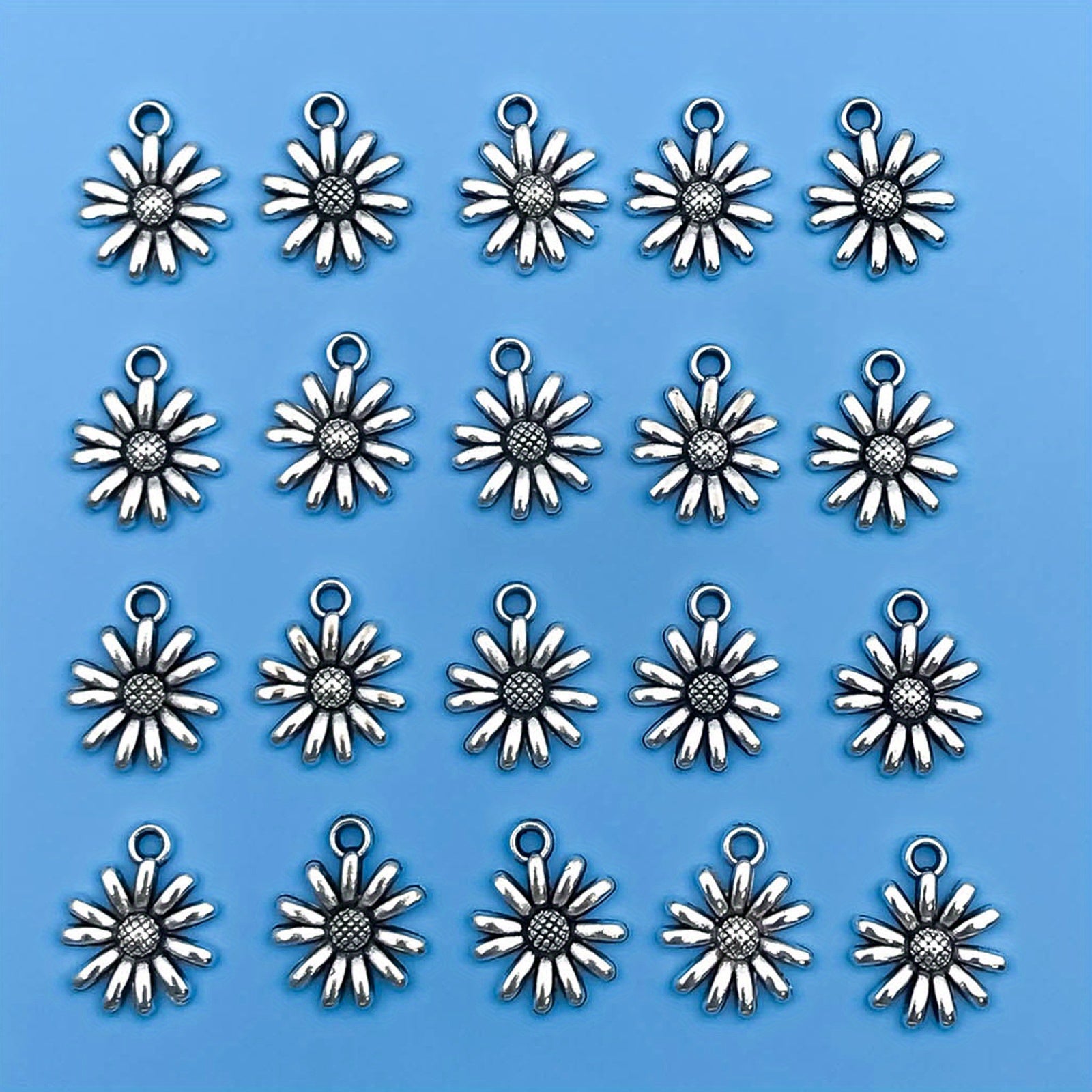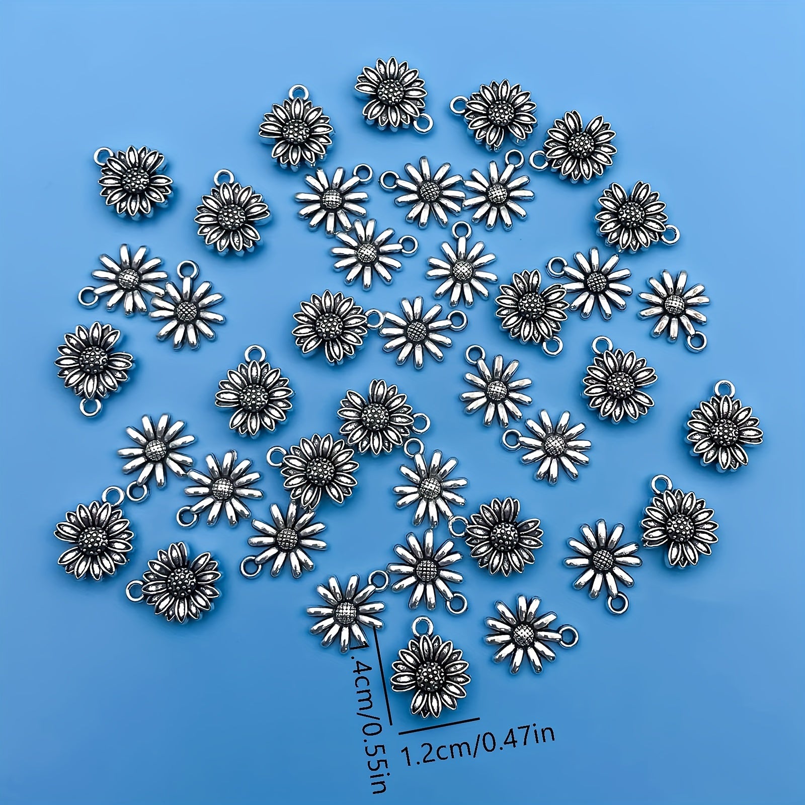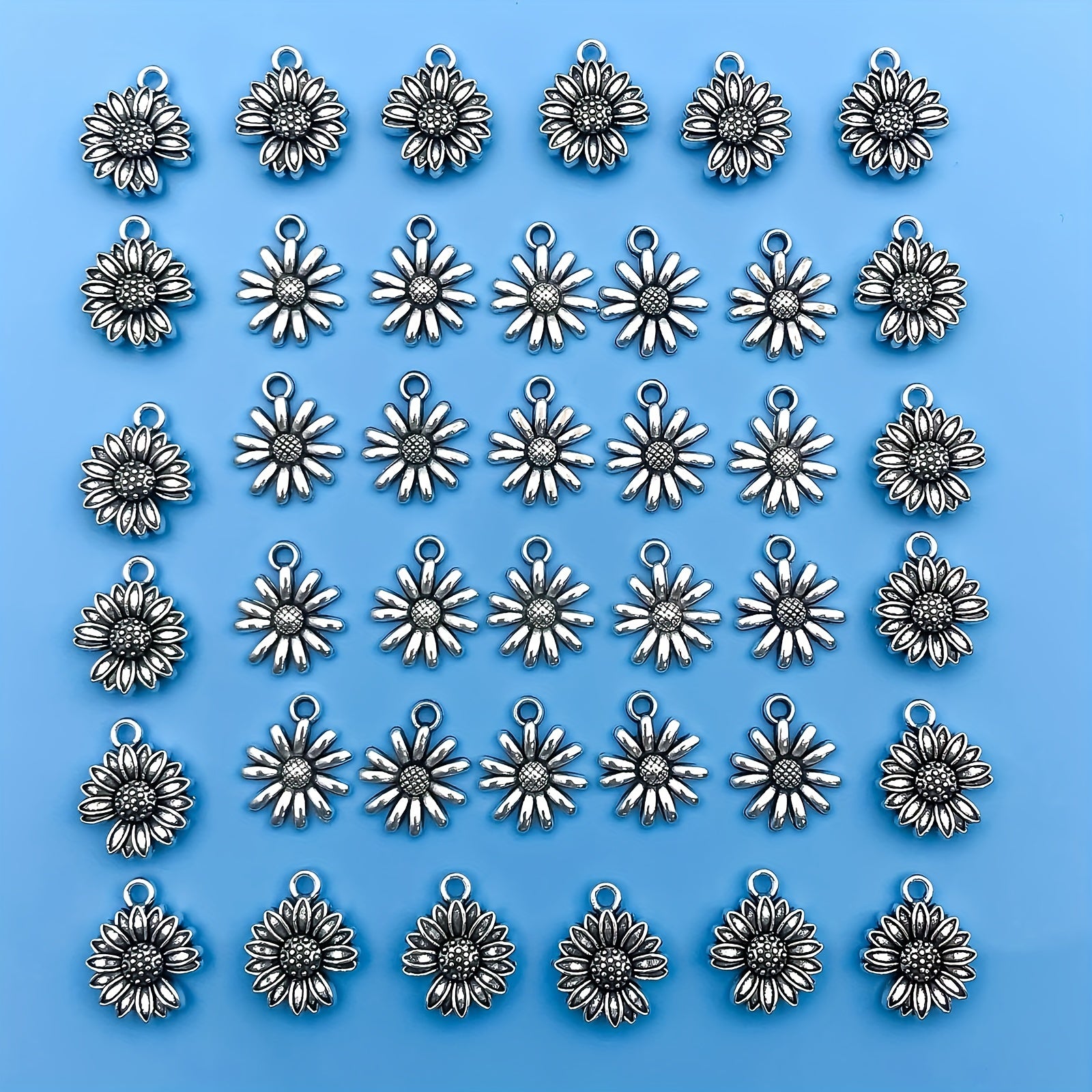 These antique silvery charms are shaped like sunflowers and little daisy flowers, perfect for crafting unique jewelry pieces.