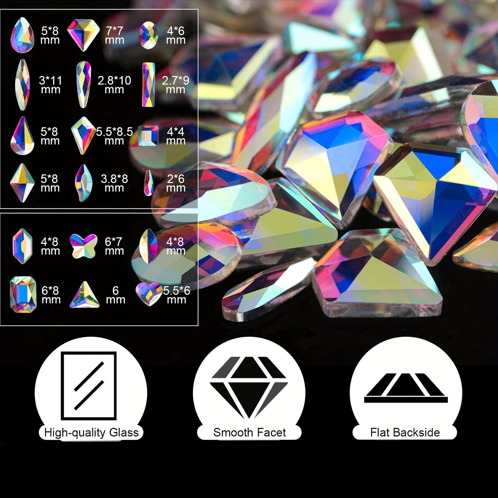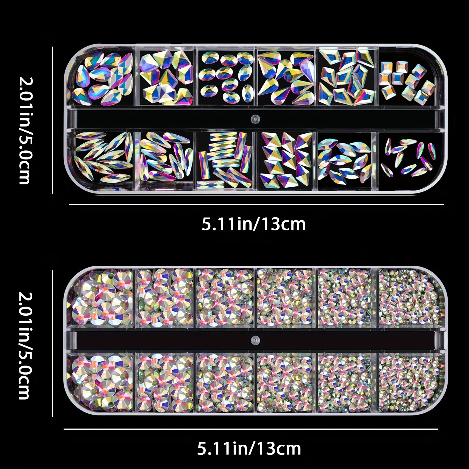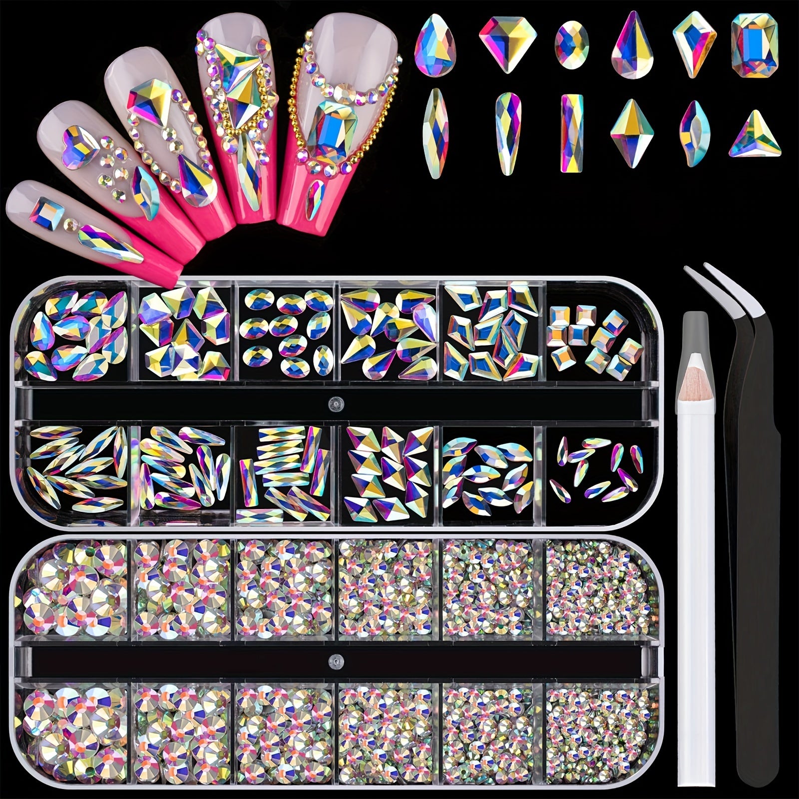 Enhance your nail art with this set of 2120 transparent rhinestones in 12 different styles. These 3D glass crystals are perfect for creating stunning nail designs. Includes a rhinestone picker for easy application.