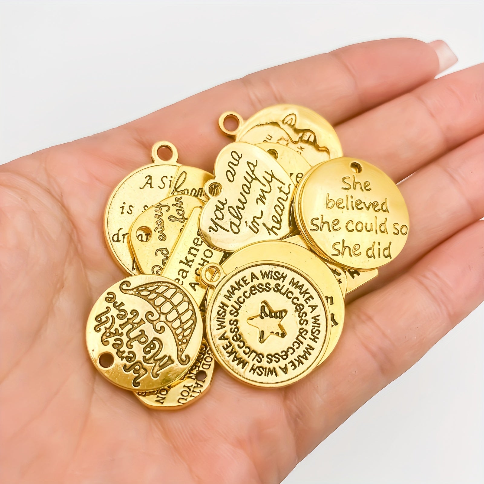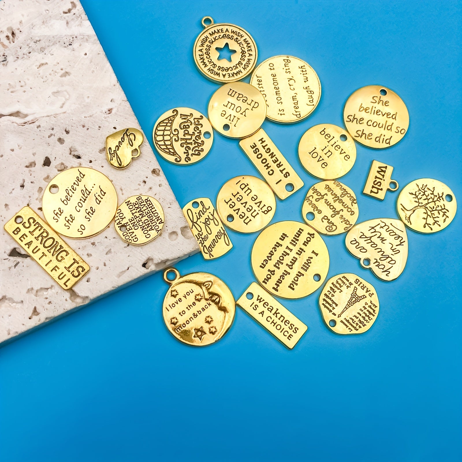 This set includes 21 zinc alloy pendants in antique golden finish with letter, circle and square shapes. Perfect for creating necklaces, bracelets, earrings and other jewelry pieces.