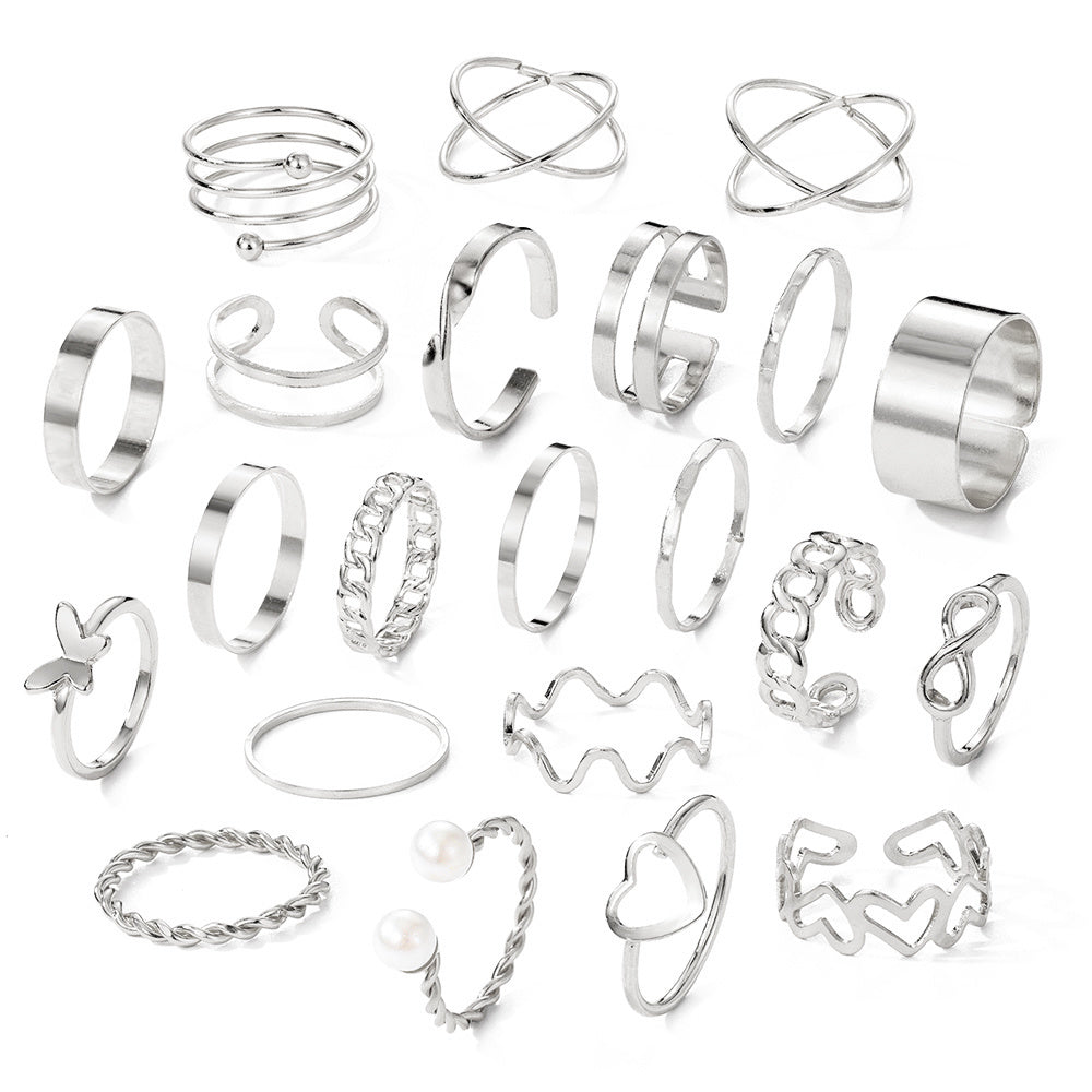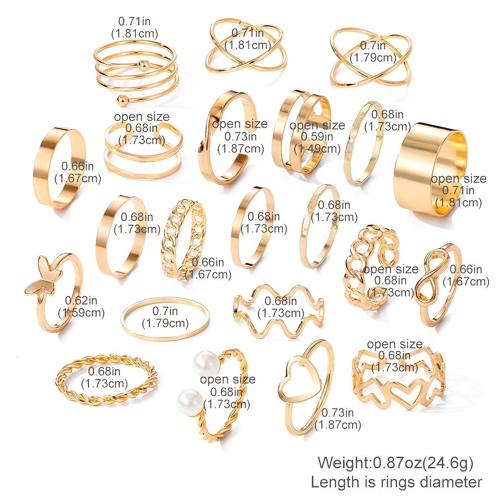 Elevate your style with this set of 22 exaggerated gold and silver rings featuring twist, wave, and love patterns. Perfect for stacking or wearing individually.