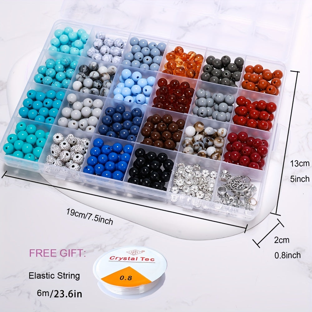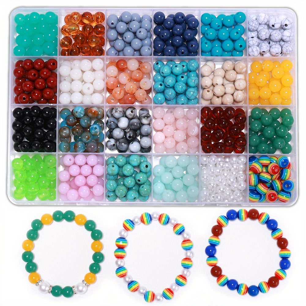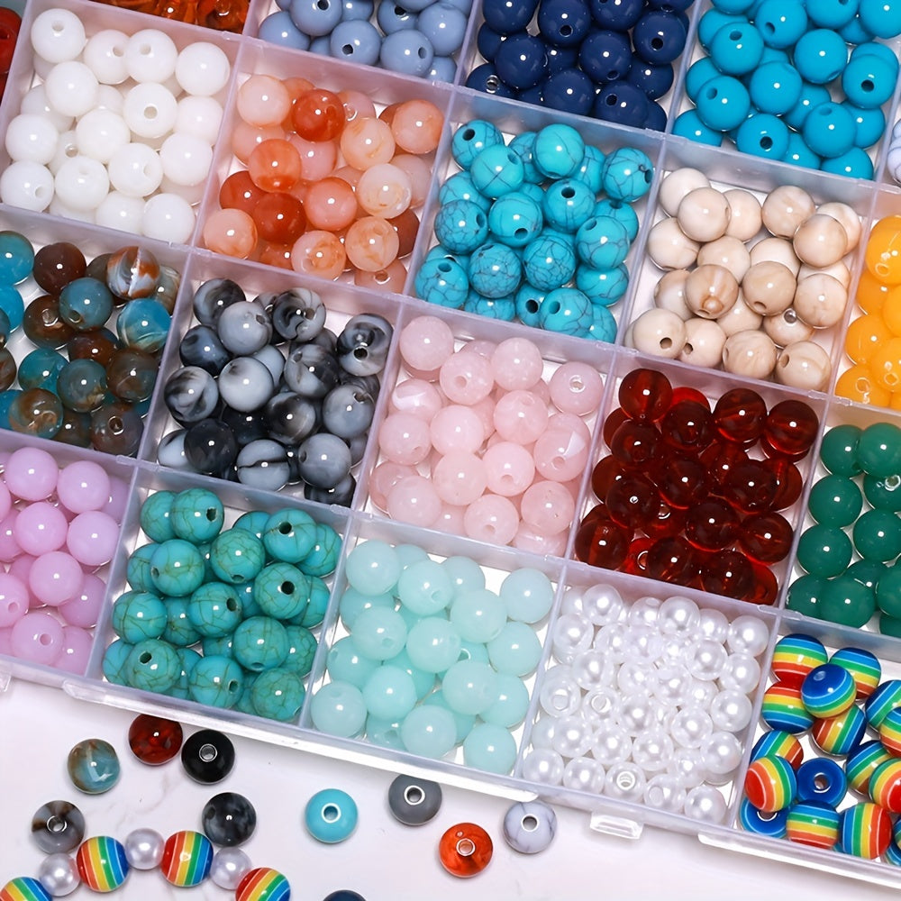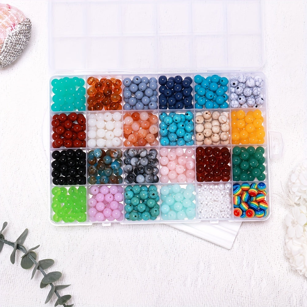 This box contains 24 grids of 8mm round acrylic beads that are perfect for creating your own earrings, bracelets, necklaces, and other accessories.