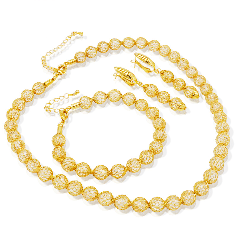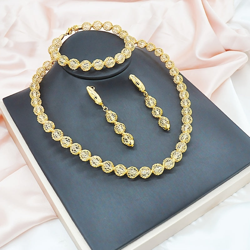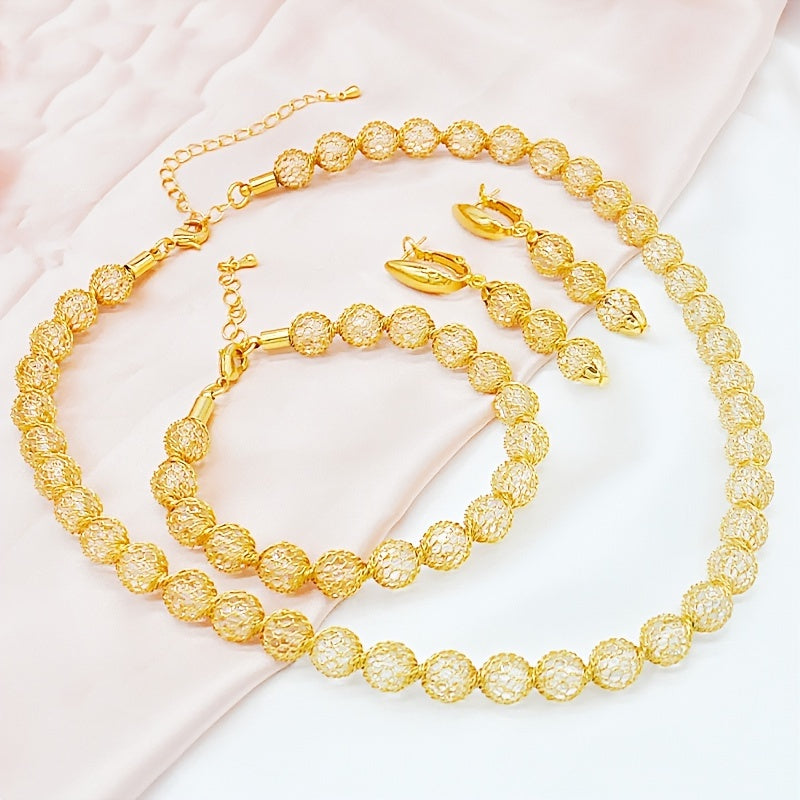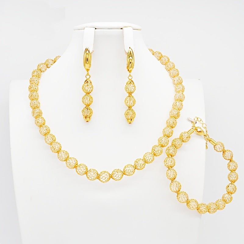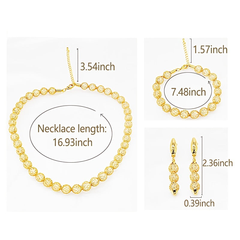 Enhance your style with this stunning 24K plated copper jewelry set featuring a choker necklace, dangle earrings, and a chain bracelet. Ideal for adding a touch of elegance to any outfit.