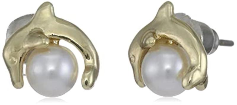 Elegant and playful dolphin stud earrings featuring freshwater pearls. Plated with 24kt gold.