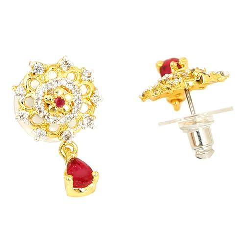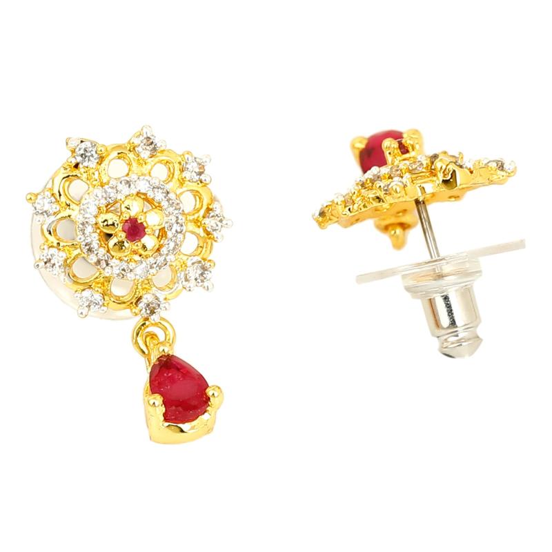 Elegant earrings featuring American diamonds and a stunning ruby drop, plated with 24Kt gold. Perfect for special occasions.