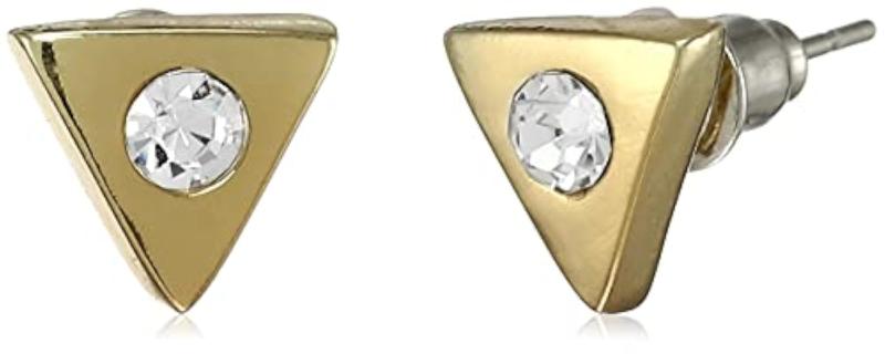 Elegant triangular stud earrings plated with 24kt gold and featuring a single Austrian crystal.