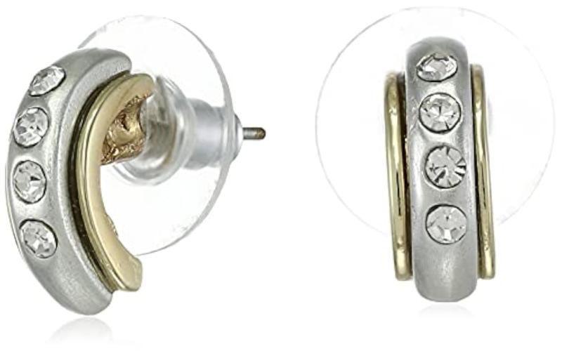 Elegant half-hoop stud earrings featuring Austrian crystals, plated with 24Kt gold and rhodium for a luxurious finish.