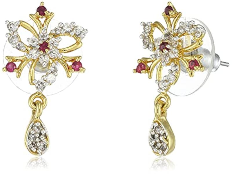 Add some glamour to your look with these stunning trillium textured tear drop earrings. Made with high-quality CZ stones, these earrings are plated with 24Kt gold and rhodium for extra shine.