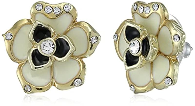 Elegant stud earrings featuring dual daffodil flowers with enamel and Austrian crystals. Crafted with 24Kt and rhodium plating for a luxurious finish.